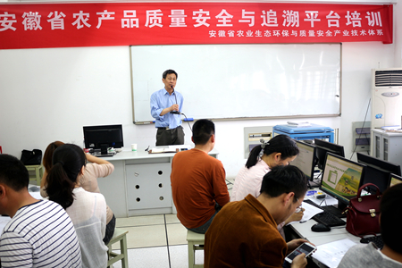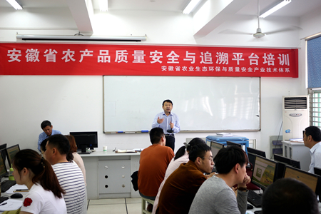 张友华为学员们介绍了安徽省农产品质量安全与追溯平台建设的背景、目标,平台建设框架和建设内容,为学员们进行了平台操作的基础培训,来自安徽省农业生态环保与质量安全产业技术体系的溯源技术团队成员为学员们进行了进一步的现场培训和技术指导。