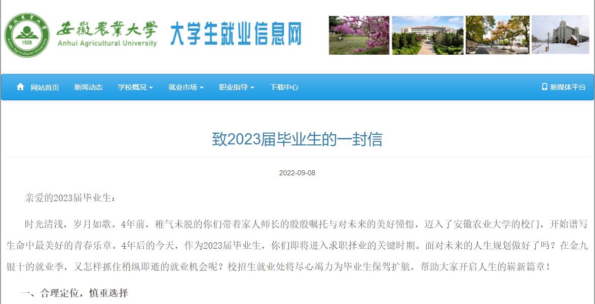精心谋划布局,及时启动工作。开学以来,根据2023届毕业生就业工作的统一安排,我校主动做好毕业生就业形势研判,积极应对疫情对就业工作的不利影响,各项工作有条不紊进行。坚持科学谋划。开展2023届毕业生就业意向调查,及时准确掌握毕业生的就业意向和实际需求;发布《致2023届毕业生的一封信》,鼓励毕业生认清就业形势,做好就业准备。及早部署启动。编印《安徽农业大学2023届毕业生生源手册》,主动寄送给用人单位并向社会公布;发布《安徽农业大学2023届毕业生就业市场工作安排》,并在用人单位中广泛宣传;开展2023届毕业生生源审核,并发布毕业生和用人单位网签操作指南,为毕业生网签做好充分准备。