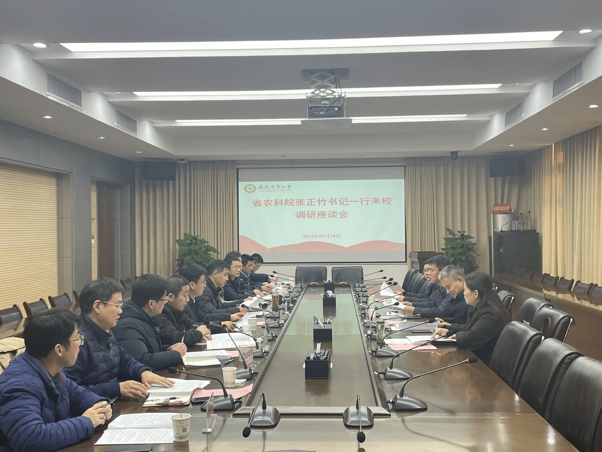 本网讯 1月10日下午,安徽省农科院党组书记、院长张正竹一行来校交流共建“安徽省茶产业研究院”事宜。座谈会前,校党委书记张庆亮会见了张正竹一行,对其来访表示欢迎。校党委常委、副校长吴祥为主持座谈会。