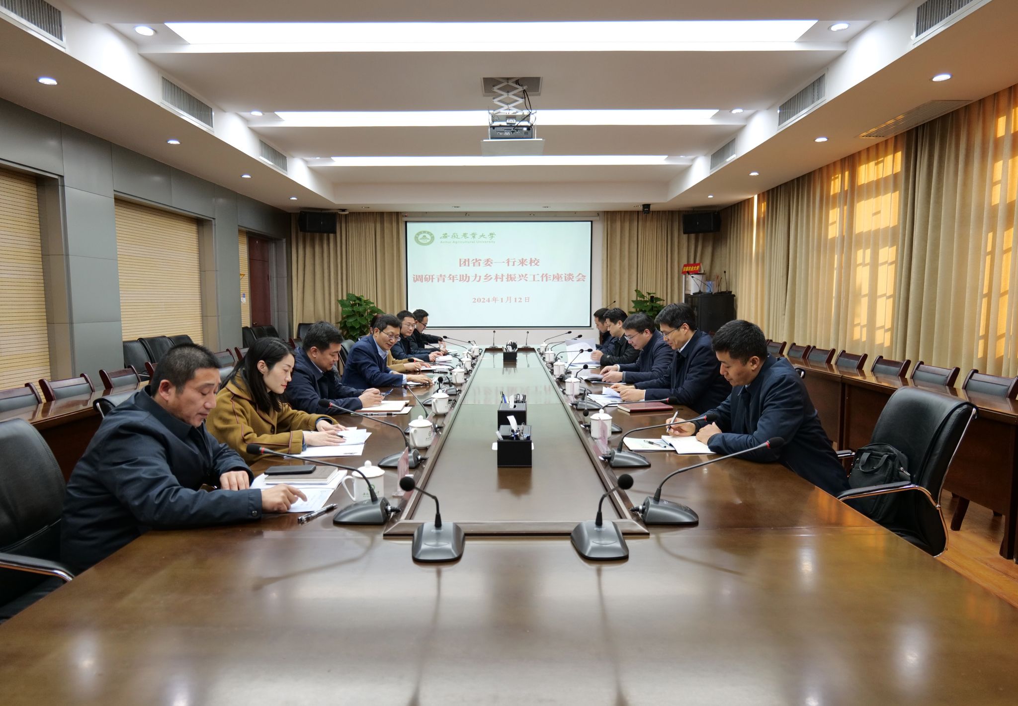本网讯 1月12日,团省委书记陈明生一行来校调研青年助力乡村振兴工作。校党委书记张庆亮主持召开座谈会。校党委常委、副校长李红,团省委副书记张健参加调研和座谈。