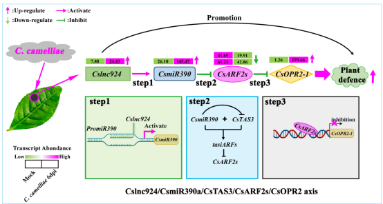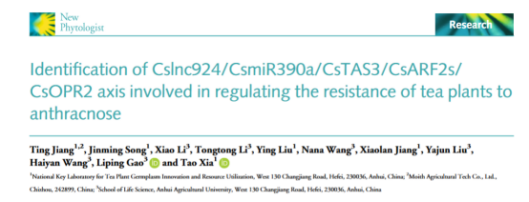 本网讯 近日,学校茶树种质创新与资源利用全国重点实验室夏涛、高丽萍教授团队在国际著名期刊New Phytologist上发表题为“Identification of Cslnc924/CsmiR390a/CsTAS3/CsARF2s/CsOPR2 axis involved in regulating the resistance of tea plants to anthracnose”的研究论文。本研究首次在茶树中解析一条全新的长链非编码RNA调控通路,系统阐明了Cslnc924/CsmiR390a/CsTAS3/CsARF2s/CsOPR2调控轴在茶树抵御炭疽病中的分子机制,为茶树抗病分子育种提供了关键靶点与理论支撑。