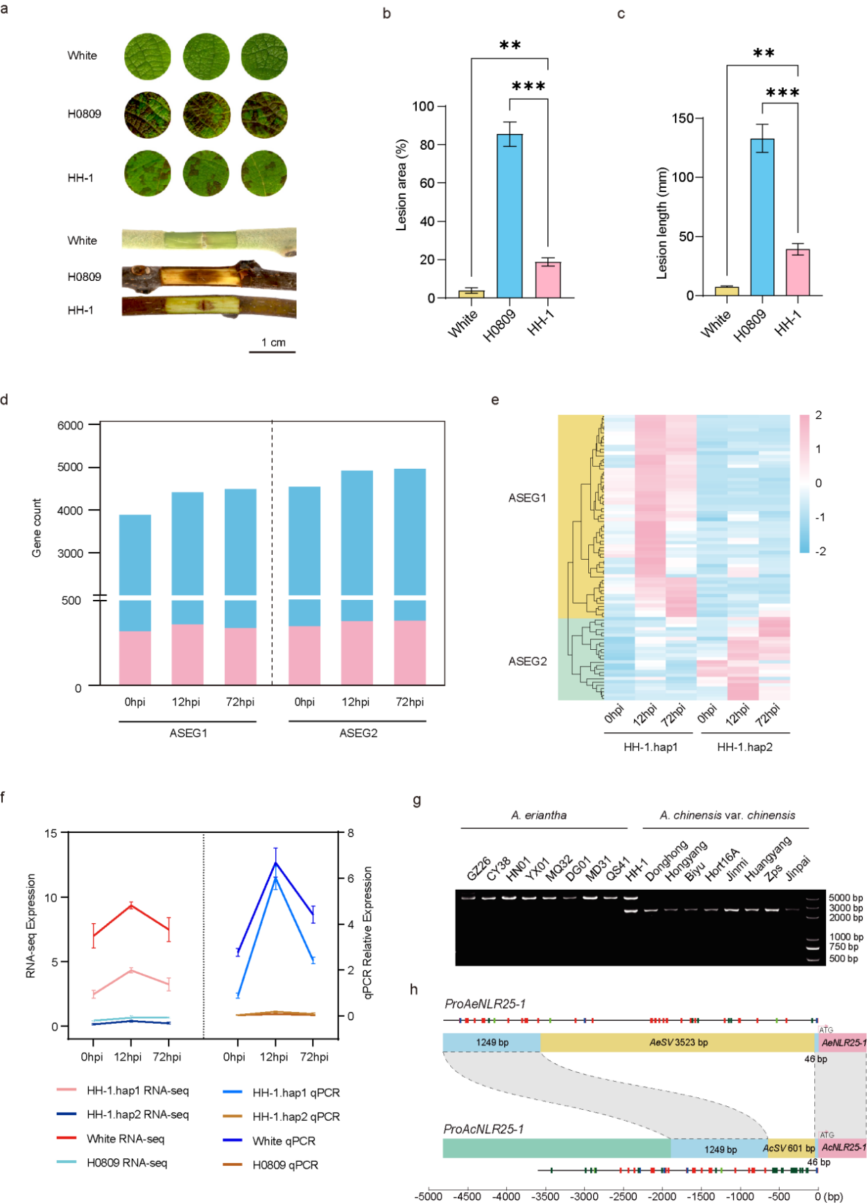 同时,研究团队对‘HH-1’样本及其亲本‘White’(毛花猕猴桃)和‘H0809’(中华猕猴桃)开展了溃疡病侵染后的转录组分析,发现在接种Psa病菌后12h和72h时,毛花猕猴桃中的NLR25-1基因表达量显著高于中华猕猴桃,提示其可能参与调控猕猴桃溃疡病抗性。