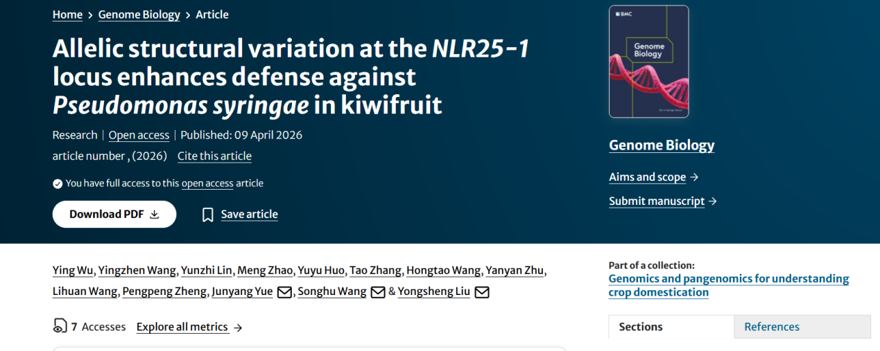 本网讯 4月9日,园艺学院刘永胜团队在《Genome biology》发表题为“Allelic structural variation at the NLR25-1 locus enhances defense against Pseudomonas syringae in kiwifruit”的研究论文,该研究构建了包含毛花猕猴桃和中华猕猴桃两个物种的种间泛基因组,并结合种间杂交F1子代的等位基因差异表达分析,鉴定到一个位于NLR25-1基因位点启动子的种内保守且种间高度分化的结构变异。该变异在毛花猕猴桃中引入了一个物种特异性的WRKY转录因子结合位点,允许WRKY75激活其表达,从而增强毛花猕猴桃了对Psa的防御能力。