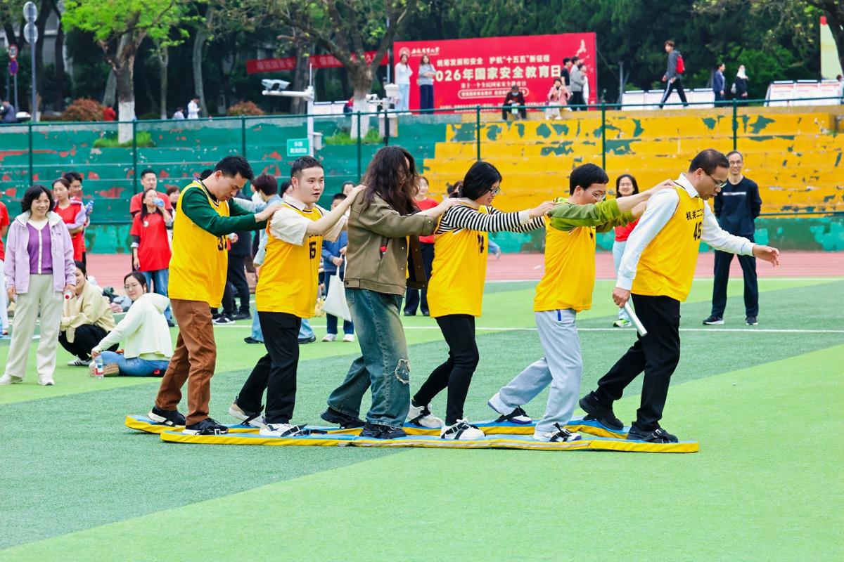 本网讯 4月15日,我校第三届教职工趣味运动会在田径运动场开赛,来自全校23个分工会的500余名教职工齐聚赛场,共同呈现了一场别开生面的体育嘉年华。校党委常委、副校长李红出席活动并宣布运动会开幕,离退休工作处、校工会、体育部负责同志及各分工会主席参加了开幕式。本次运动会打破传统竞技模式,引入全新项目,以“协作+趣味”为核心,设置A、B两组同步赛制,依次开展“同心协力”“手舞足蹈”“组合接力”“波涛汹涌”“龙腾万里”五个项目;同时,还为离退休教职工另辟专场,设置了“飞盘”和“套圈...