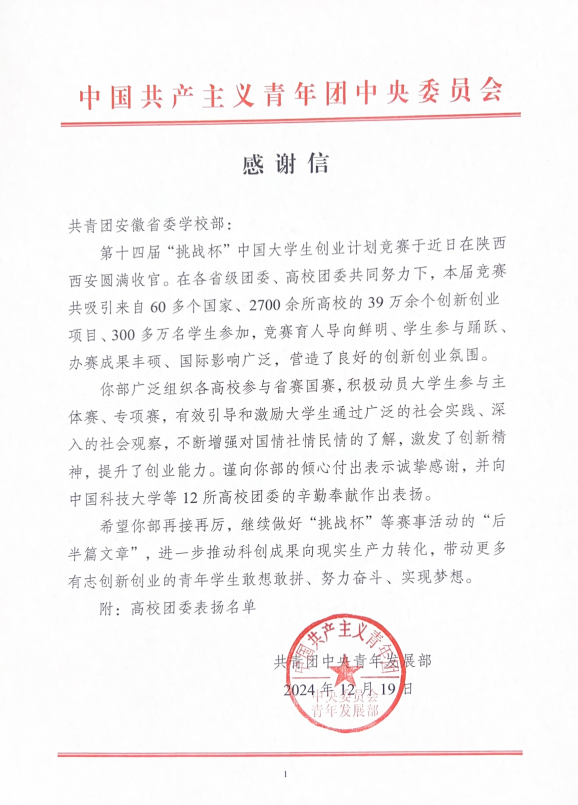 本网讯 近日,共青团中央青年发展部发来感谢信,对我校第十四届“挑战杯”中国大学生创业计划竞赛的组织工作表示感谢与表扬。