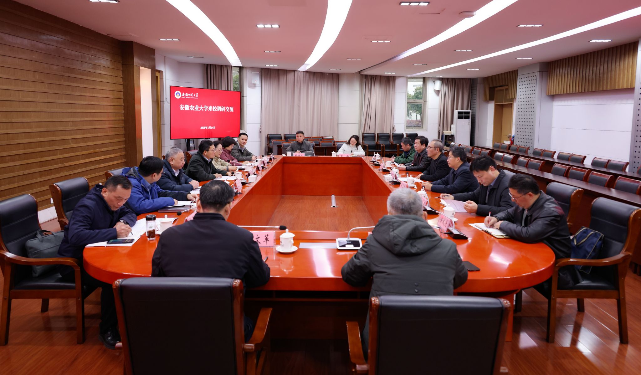 本网讯 1月14日,校领导张庆亮、李红、陈文兵率队到安徽师范大学调研交流,开展“寻根溯源铭初心 改革创新向未来”主题活动,受到安徽师范大学党委书记蒋家平,党委常委、副校长曾黎明,党委副书记胡靖的热情接待。