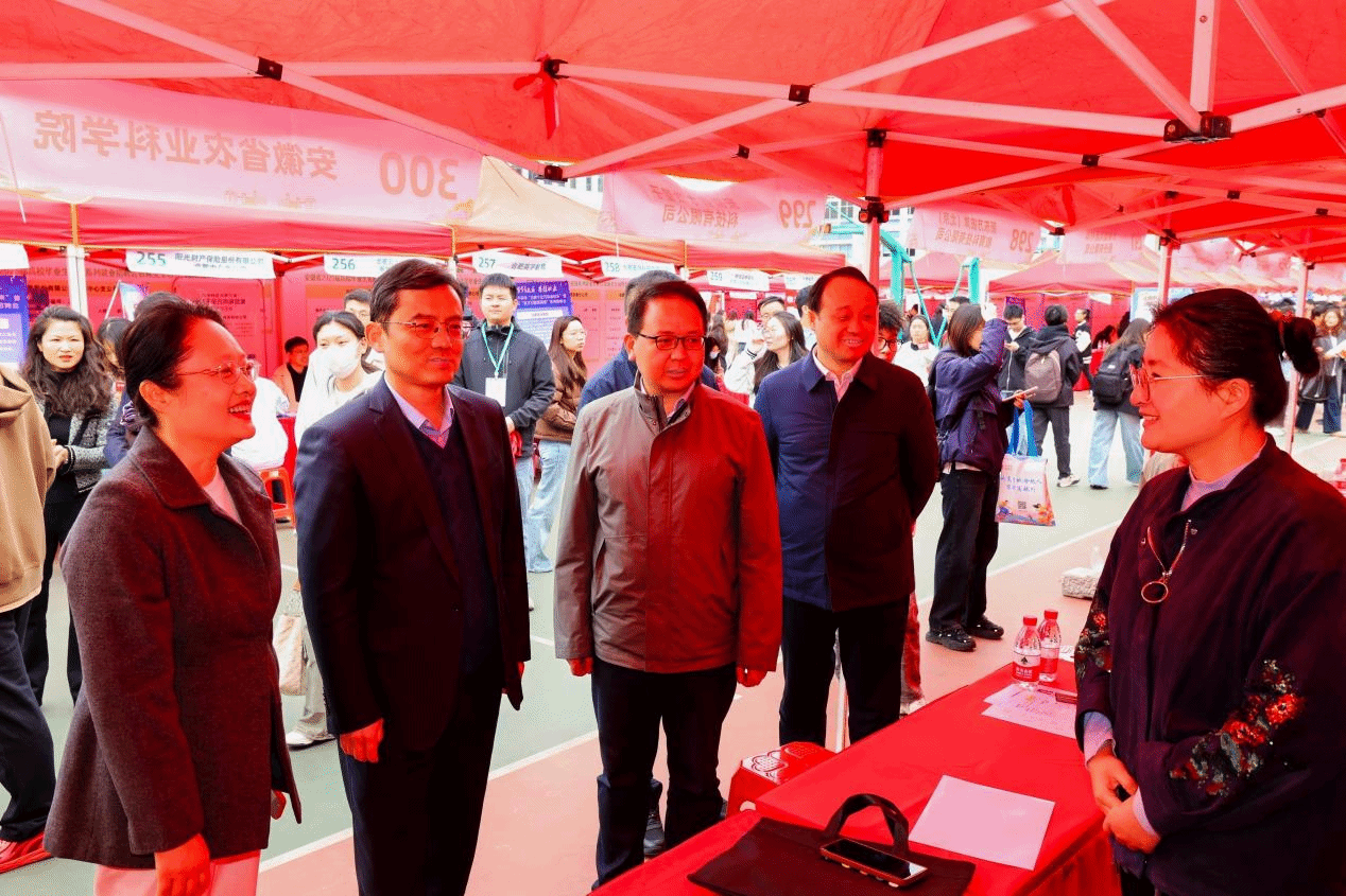 本网讯 3月28日上午,我校在第二运动场举办“人才兴皖 ‘就’在江淮”安徽省2025届高校毕业生省级系列就业招聘会农林类专场暨安徽农业大学毕业生春季双选会、校友企业招聘会。校领导李红、陈黎卿,合肥市庐阳区委书记高强,区委常委、组织部部长项贤勇,区委常委、纪委书记李春等到现场与用人单位和毕业生亲切交流,了解用人单位需求和毕业生就业情况并推介我校毕业生。