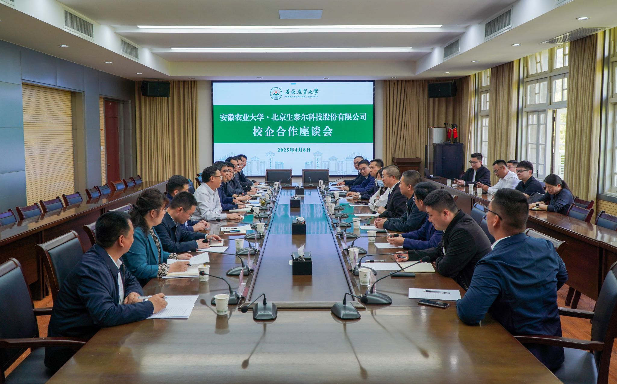 本网讯 4月8日,北京生泰尔科技股份有限公司总裁江厚生及总裁办全体成员来校开展调研交流。校党委副书记、校长操海群出席校企合作座谈会,党委常委、副校长蔡德军主持会议。