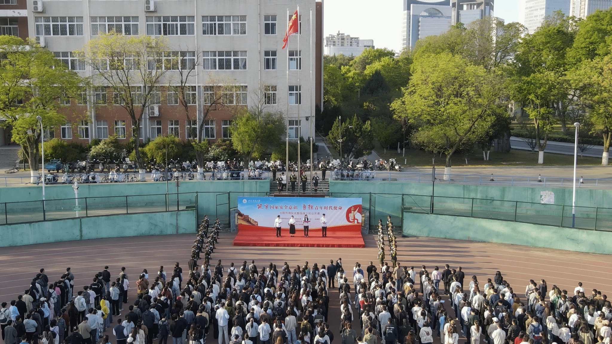 本网讯 4月14日,在第十个全民国家安全教育日到来之际,学校在第一运动场举办“筑牢国家安全意识 勇担青年时代使命”主题升旗仪式暨国旗下的公开课。校党委常委、副校长陈黎卿到场讲课,校党委学工部、研工部、武装部、马克思主义学院等单位主要负责人,各学院师生代表等700余人参加此次活动。