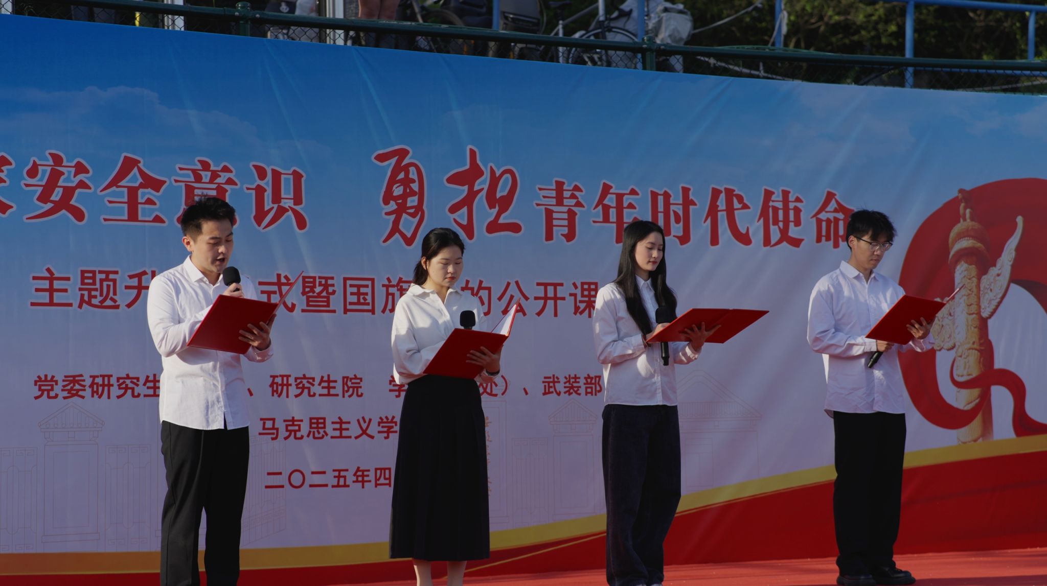 马克思主义学院院长讲授《以青春之名,守护国旗之下的万里山河》公开课,提醒同学们国家安全是刻不容缓的“生存命题”,新时代青年应筑牢思想防线、锤炼专业本领、投身全民行动。马克思主义学院研究生代表带来国旗下的诵读《十年砥砺 共护国安》。