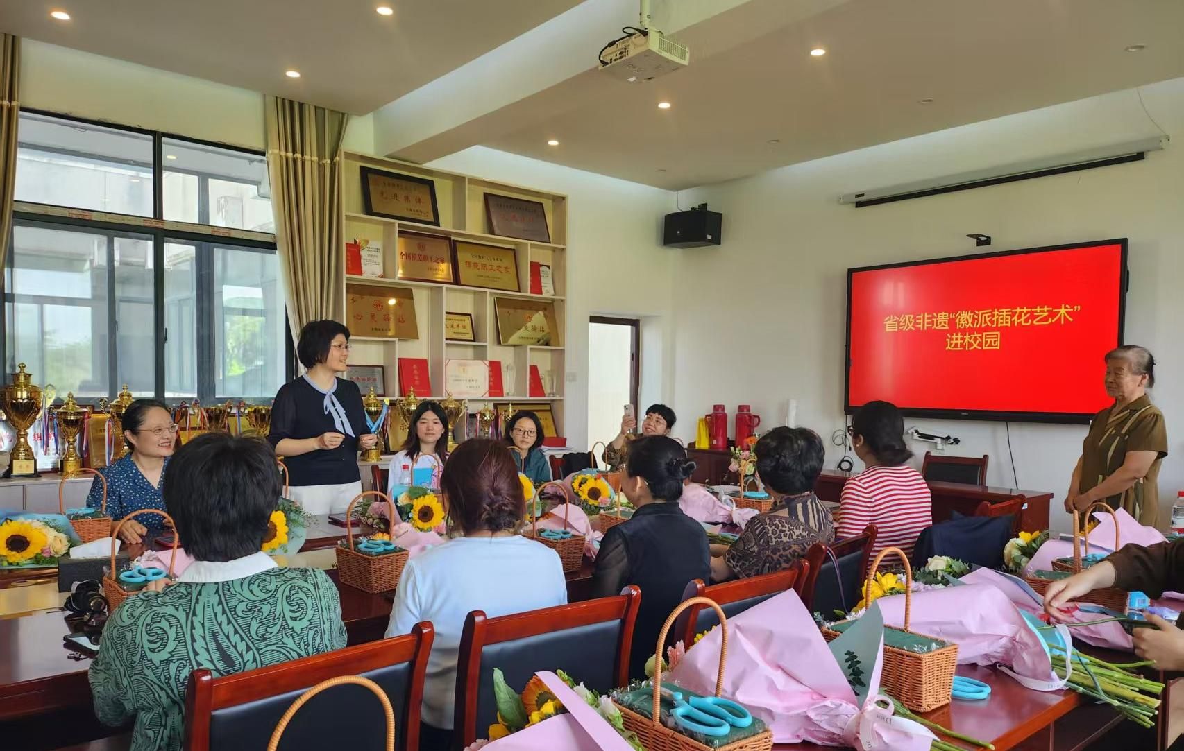 活动中,付玉兰介绍了“徽派插花”的内涵和特色。安徽省省级非遗项目“徽派插花艺术”传承团队还授予我校省级非遗“徽派插花艺术传承基地”称号。活动现场举行了授牌仪式,付玉兰教授和校工会主席共同为传承基地揭牌。(文/姬惠惠 图/钱杰 编辑/薛美霞 预审/赵智 审核/夏利明)