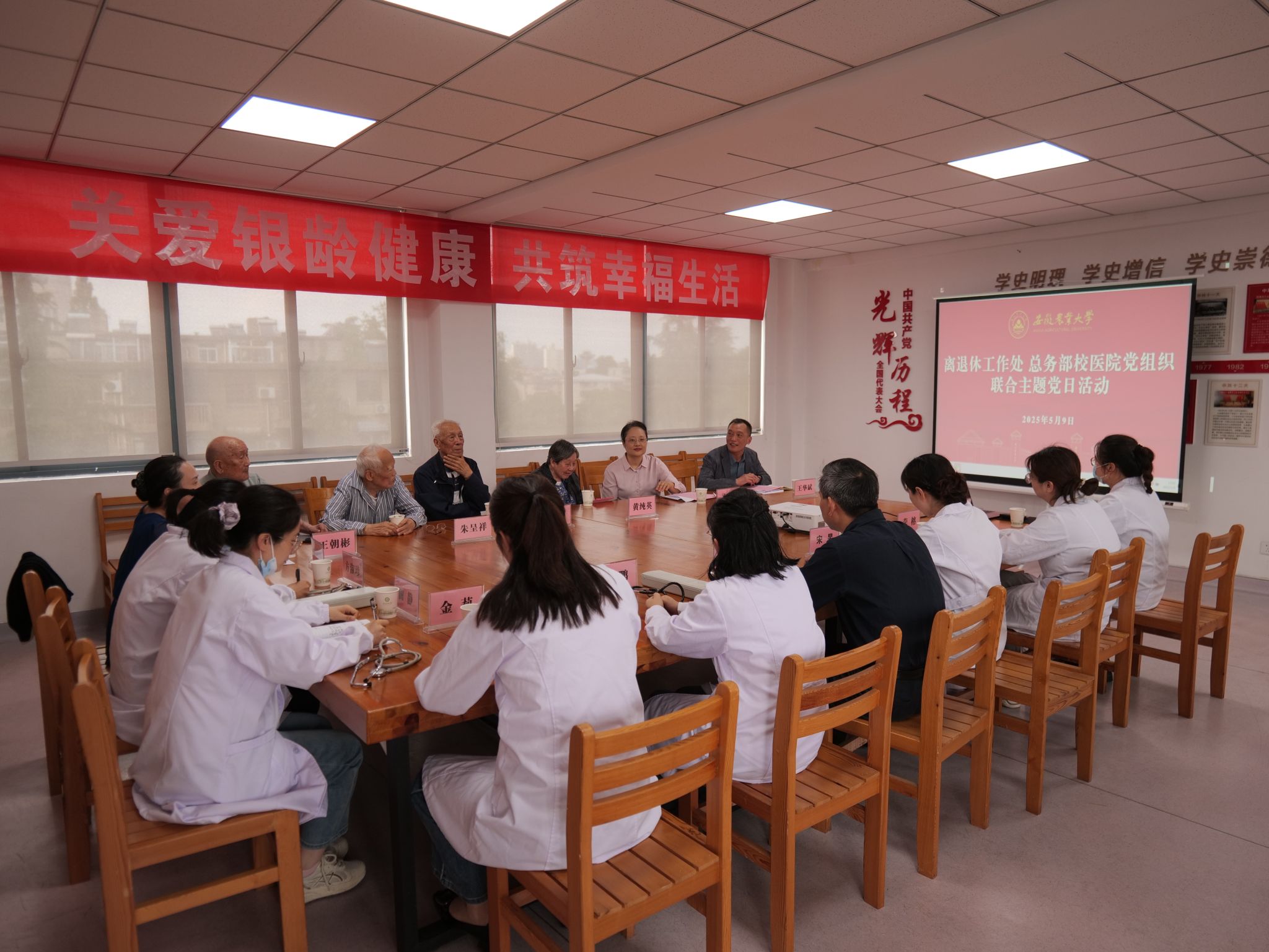 本网讯 5月9日,离退休工作处与校医院积极主动从师生急难愁盼中检视作风差距,强化“服务意识”,用心用情关爱离休老同志身体健康,通过党组织结对共建,开展以“关爱银龄健康,共筑幸福生活”为主题的主题党日活动。校党委常委、副校长李红出席活动并讲话。离休老同志代表,离退休工作处、总务部校医院相关负责同志及党员医生参加活动。