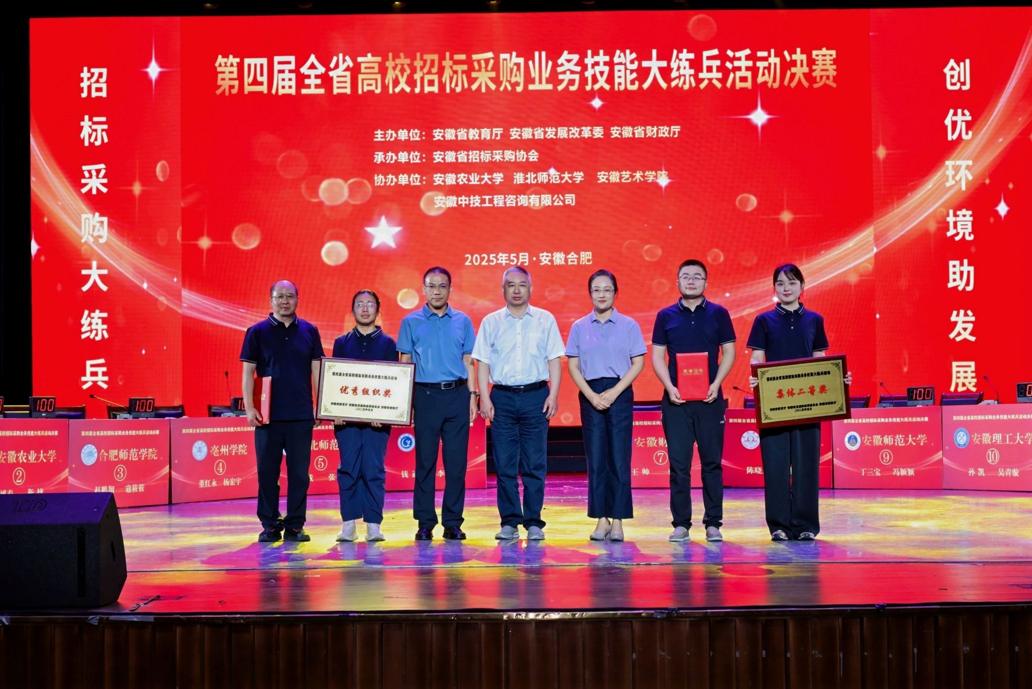 本网讯 5月29日,安徽省第四届高校招标采购业务技能大练兵活动决赛在安徽艺术学院开展。我校荣获集体二等奖、优秀组织奖,采购与招标中心梅林、张惠娟、吴博春荣获个人二等奖。