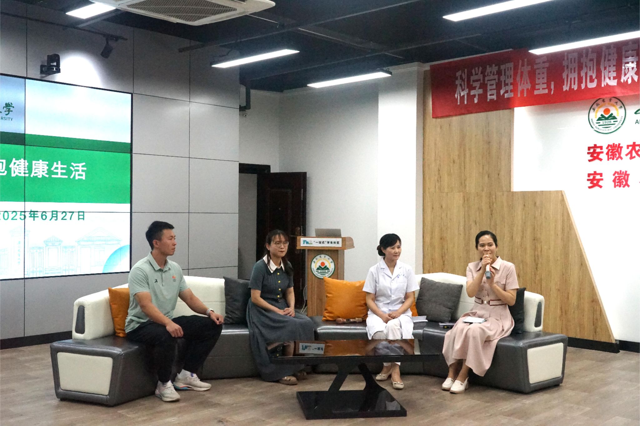 本次活动汇聚医疗、营养、运动领域专家,采取访谈方式,从健康检测、膳食管理、运动干预三大维度,构建起“三位一体”的健康教育创新平台。校医院院长、副主任医师宋旻揭示健康监测数字背后的秘密,同时结合针灸特色疗法,系统阐释中医在调节气血循环、改善代谢功能方面的独特优势;食品与营养学院教师王红燕聚焦大众饮食现状,强调科学饮食不是节食,而是学会“聪明吃”,吃得对才能瘦得健康;体育部教师戚孙恺从运动科学角度切入,系统讲解利用碎片时间进行有氧运动与力量训练运动方案。