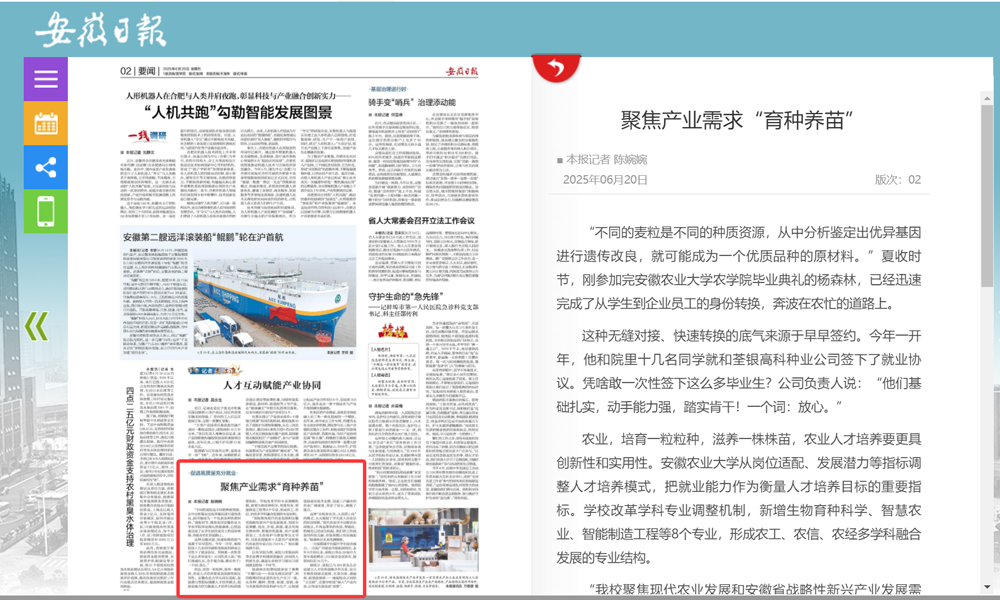 同时,6月20日,《安徽日报》要闻版以《聚焦产业需求“育种养苗”》为题,刊发了学校推进毕业生就业的典型事迹。(文图:郑雪林 初审:林婷婷 复审:夏利明 终审:曹雷)