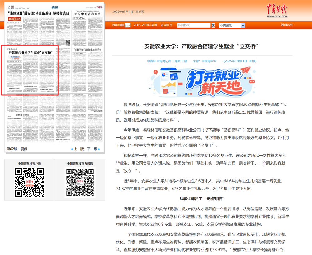 本网讯 7月11日,《中国青年报》要闻版以《安徽农业大学:产教融合搭建学生就业“立交桥”》为题,报道了我校在创建“双一流”征程中,坚持创新人才培养模式、提升人才培养质量,以科教融汇、产教融合不断提升学生就业质量的典型做法。