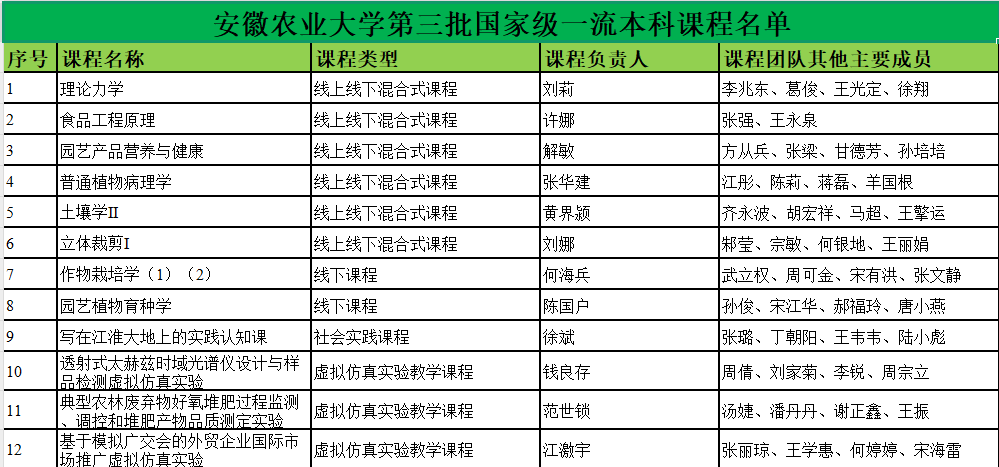 本网讯 近日,教育部发布了《关于第三批国家级一流本科课程认定结果的公示》,我校12门课程成功入选,获批总数位列全国农业类院校第6、安徽省属高校第2,实现历史性突破。结合此前两批认定的13门课程,我校国家级一流本科课程累计达25门,为一流专业建设和学科发展奠定了坚实课程基础。