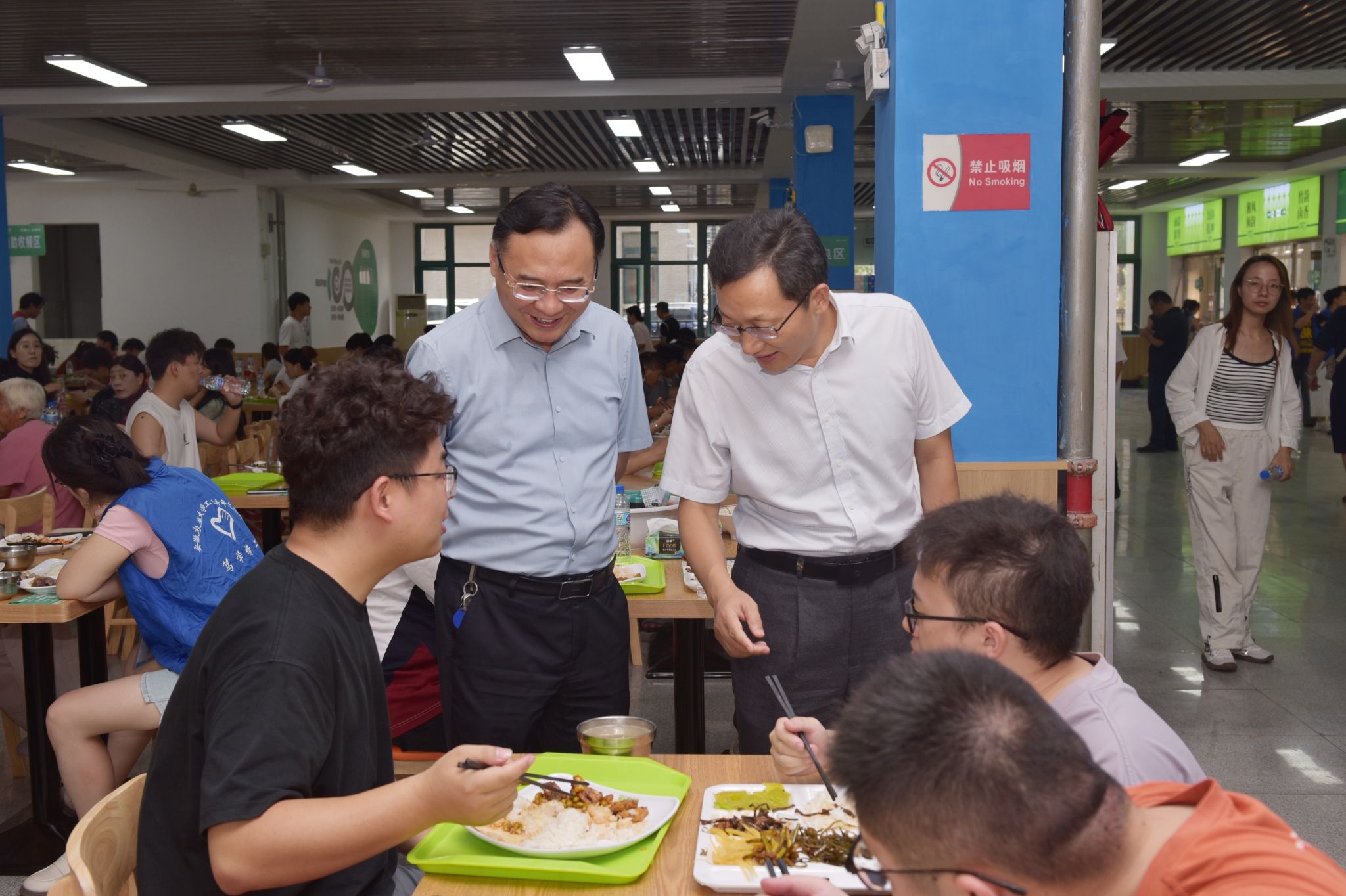 校领导张庆亮、操海群、董雨、蔡德军、陈黎卿、江海洋在相关部门负责同志陪同下,深入迎新现场、宿舍、食堂等,同新生及家长亲切交流,仔细查看新生报到的各环节工作,慰问工作人员及学生志愿者。