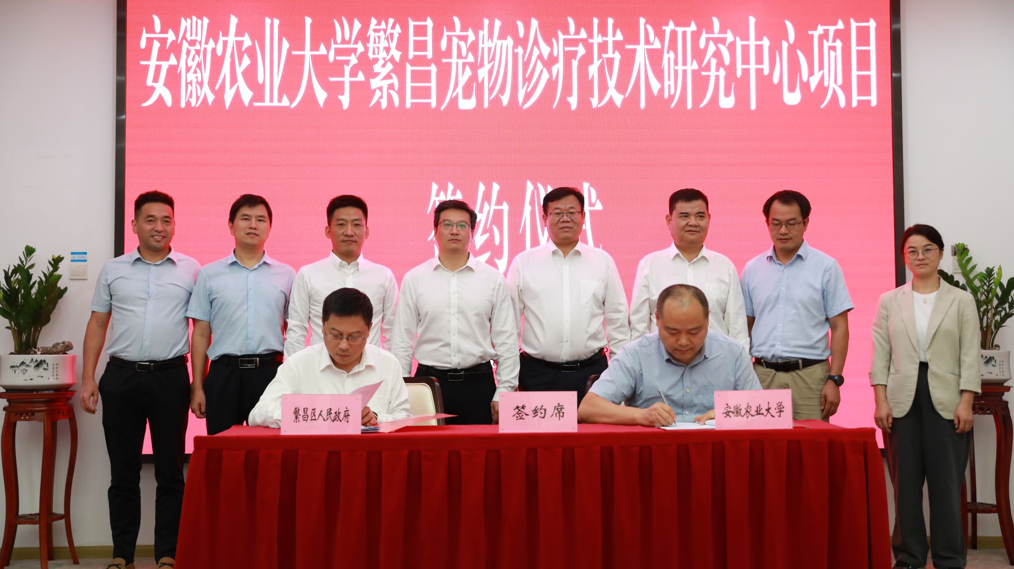 本网讯 9月20日上午,我校与繁昌区人民政府、安徽繁盛投资控股集团有限公司共建“安徽农业大学繁昌宠物诊疗技术研究中心”签约仪式在繁昌举行。校党委常委、副校长江海洋,繁昌区委书记瞿辉,区委副书记、区长许有龙,区委常委、常务副区长王铭华,副区长王安源等出席签约仪式。