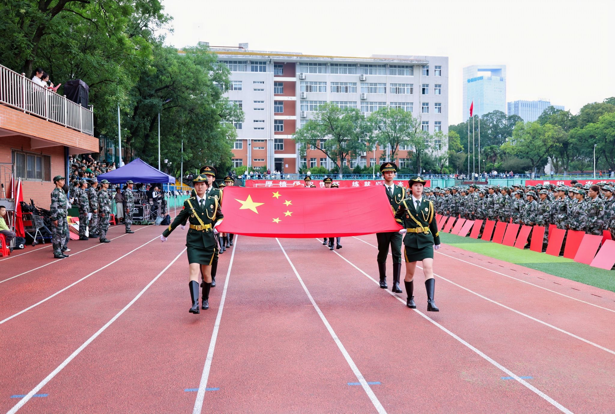 5400余名新生接受了检阅,他们身着整齐的迷彩服,以挺拔的身姿、铿锵的步伐展现出2025级新生经过军训磨砺后的良好精神风貌与过硬纪律作风。在“军训内务”评比中,外国语学院荣获一等奖,人文社会科学学院、工学院荣获二等奖,动物科技学院、经济管理学院、林学与园林学院、茶业学院、园艺学院荣获三等奖;在“军训优秀队列”评比中,材料与化学学院荣获一等奖,工学院、人文社会科学学院荣获二等奖,茶业学院、动物科技学院、资源与环境学院、信息与人工智能学院、植物保护学院荣获三等奖。大会还对获评的9名军训优秀辅导员、112名军训学生标兵、11个标兵宿舍、17个优秀宿舍进行了表彰。