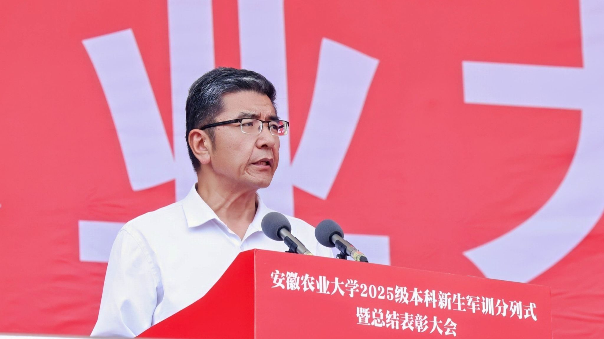 董雨代表学校向辛勤付出、无私奉献,可亲可敬的教官们表示衷心感谢和崇高的敬意!向奋力拼搏、刻苦训练,超越自我、圆满完成任务的同学们表示热烈祝贺!向团结高效、保障有力的跟训辅导员、医疗保障人员等后勤保障人员表示诚挚问候!他勉励全体新生,要厚植家国情怀,做永葆初心的追梦者。将“青春的小我”融入“祖国和人民的大我”,胸怀“国之大者”,传承“奉献、创新、奋斗”的安农精神,在专业课堂上汲取兴农知识,在田间地头锤炼强农本领,在乡村振兴的舞台上收获果实,让担当的底色在时代浪潮中愈发鲜亮。要秉持奋斗精神,做不畏艰难的开拓者。带着军训时的拼劲与韧劲,以奋斗为犁,在青春的田野上收获属于自己的梦想。积极践行“博学、敏行、善言”的优良学风,走好读书求学、成长成才之路,在追求真理中汲取能量,在躬耕实践中增长本领,在勇担使命中绽放光彩。要永葆刻苦品格,做精益求精的求知者。把军训中培养的吃苦耐劳精神、团结协作意识和严明的纪律作风,融入今后的学习和生活中,赓续“脚踏实地”的校训精神,敢于吃苦、甘于吃苦,将汗水挥洒在教室、实验室,挥洒在实践活动中,挥洒在乡村振兴第一线,勇攀科技创新的最高峰。