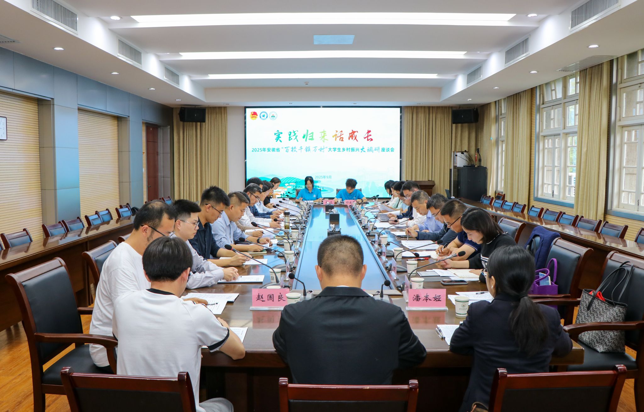 本网讯 9月25日下午,2025年安徽省“百校千镇万村”大学生乡村振兴大调研座谈会在我校第三会议室举行。共青团安徽省委副书记周宇、校党委副书记董雨、团省委学校部二级调研员汪文斌出席会议。党委宣传部、教务处、党委研究生工作部、学生处等单位负责同志,部分高校团委负责人、大学生乡村振兴大调研实践团队师生代表参加会议。