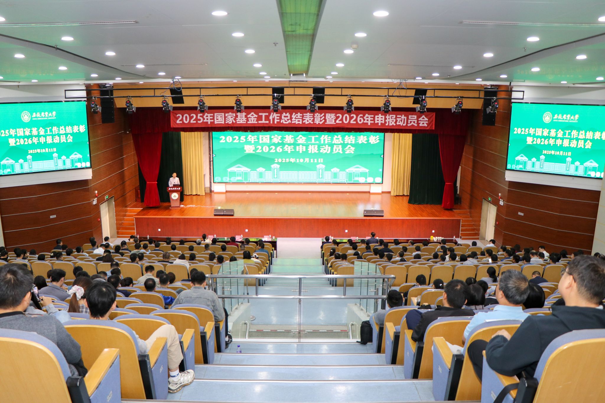 本网讯 10月11日上午,我校2025年国家基金工作总结表彰暨2026年申报动员大会在图书馆第一报告厅举行。校党委书记张庆亮出席会议并为国家基金工作先进单位颁奖,党委副书记、校长操海群作动员讲话。各学院党政负责同志、科研副院长及青年教师代表参加会议。会议由校党委常委、副校长吴祥为主持。