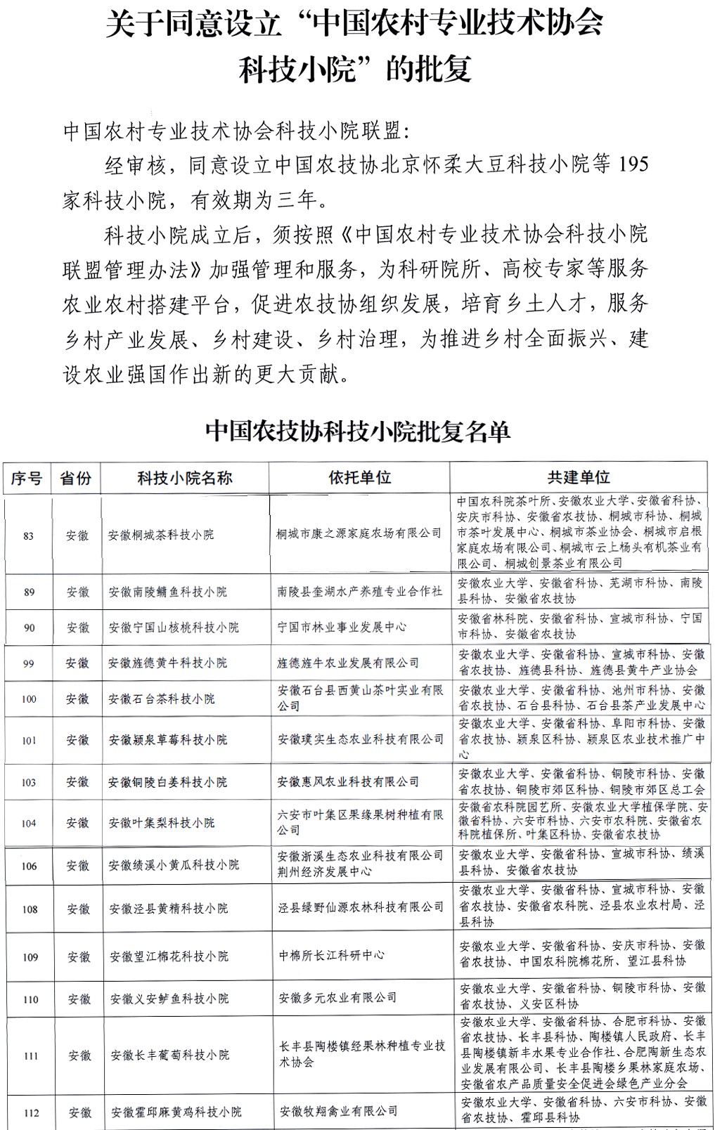中国农村专业技术协会科技小院的建设坚持“需求为主,调研为先,多维评估,资源整合,推广运行”的标准化建设流程。针对地方政府、企业、农户等需求,科技小院以地方产业为依托,聚焦解决产业发展问题,整合高校、专家、政府、企业等多方资源,通过学生入驻、技术集成、产业服务等推广运行。此次全国共支持立项建设195个科技小院,安徽省获立项支持建设科技小院共30个,我校有14个科技小院获得立项建设,分别为安徽宁国山核桃、旌德黄牛、颍泉草莓、铜陵白姜、泾县黄精、义安鲈鱼、绩溪小黄瓜、桐城茶、南陵鳙鱼、石台茶、叶集梨、望江棉花、长丰葡萄和霍邱麻黄鸡等科技小院。