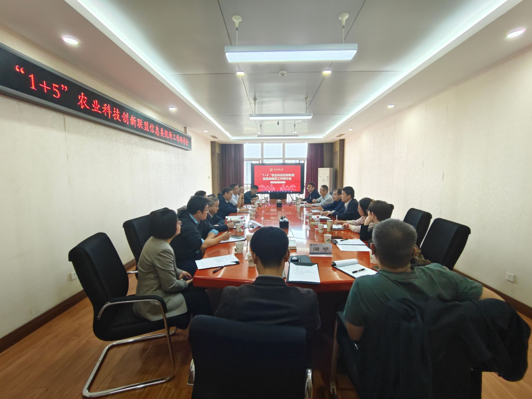 本网讯 为深入推进“1+5”农业科技创新联盟建设,加强智慧农业科技创新合作,10月15日,学术副校长董大明带队赴中国农业大学召开“1+5”农业科技创新联盟信息类院所工作研讨会。中国农业大学信息与电气工程学院、西北农林科技大学信息工程学院、华中农业大学信息学院、我校信息与人工智能学院党政主要负责人以及中国农业科学院农业信息研究所有关人员参加研讨会。
