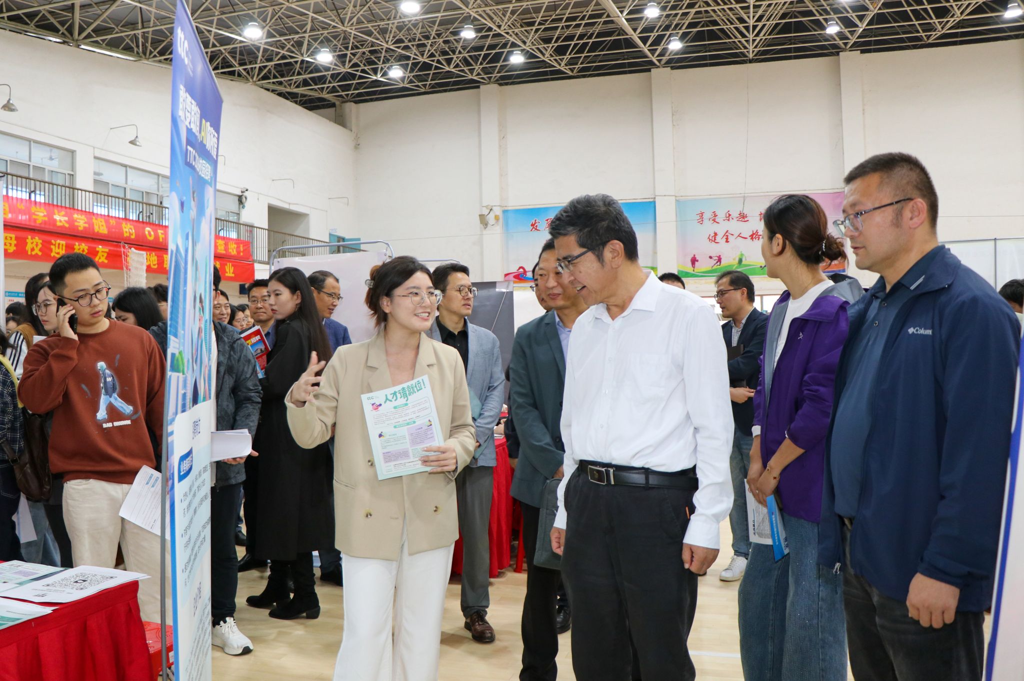 本网讯 10月17日,学校校友企业暨六安市2025年全国大中城市组团招聘会在校体育馆举办。校党委副书记董雨走访企业展位,详细了解企业人才需求和对学校人才培养工作的建议。学生处及各学院相关负责同志参加活动。