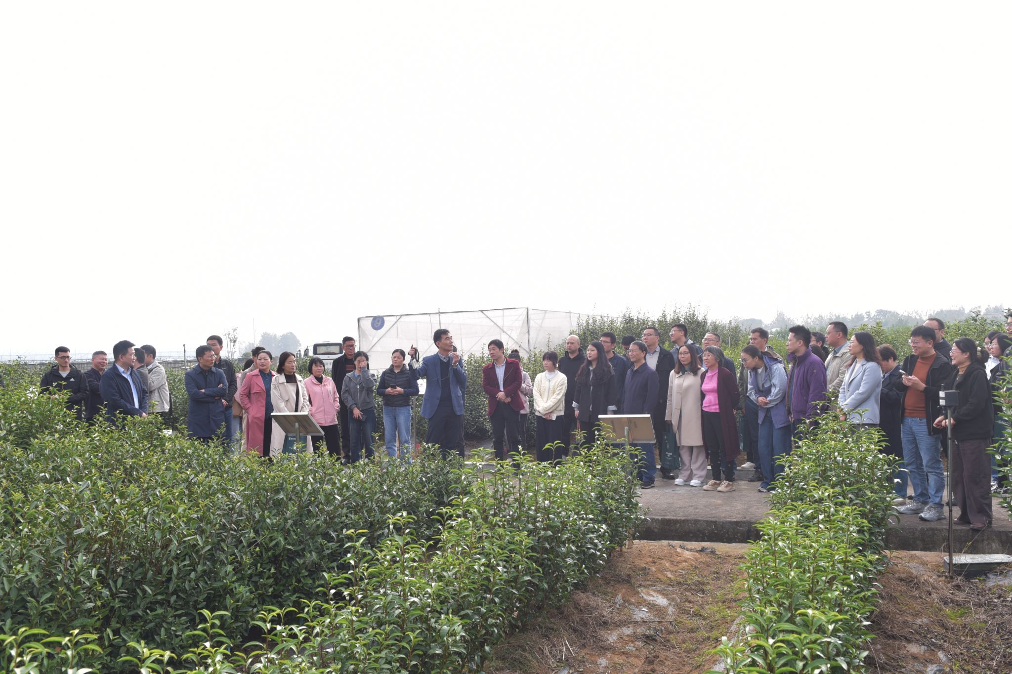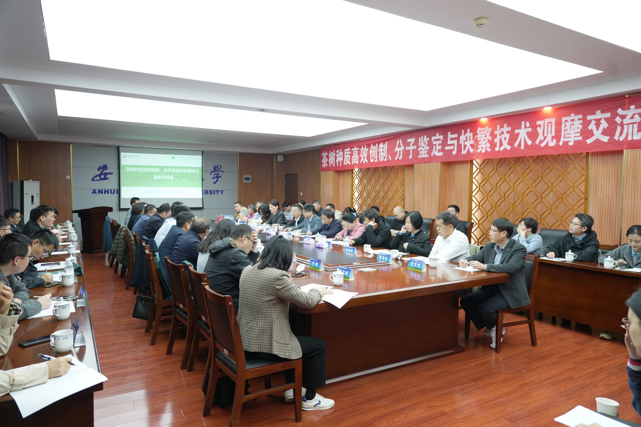 本网讯 10月25日,由茶树种质创新与资源利用全国重点实验室、国家茶树育种联合攻关组和安徽省茶业学会联合主办的茶树种质高效创制、分子鉴定与快繁技术成果观摩交流会在皖中综合试验站举办。校党委常委、副校长吴祥为,农业农村部种业司资源处、全国农技推广中心品种登记处、安徽省农业农村厅种业管理处和特产处负责同志出席会议。来自浙江大学、中国农业科学院茶叶研究所、武夷星茶业有限公司等全国涉茶高校、研究所和企业的33家单位60余人参加。