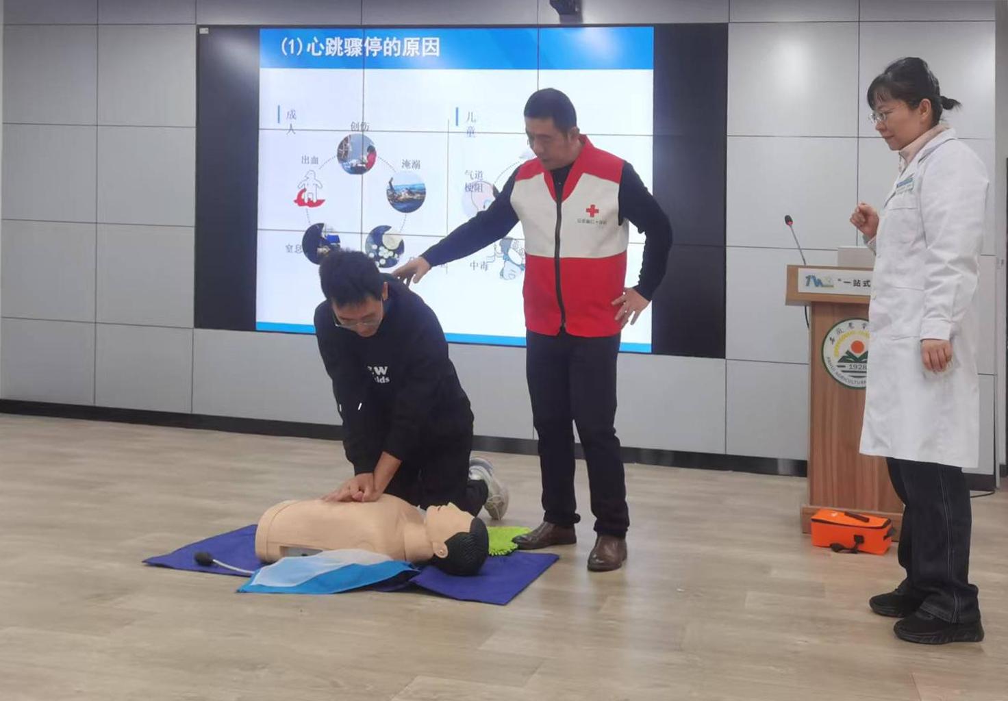 培训现场,相关工作人员系统讲解了心肺复苏(CPR)的操作规范、自动体外除颤器(AED)的使用方法及突发心脏骤停的应对策略。互动实操环节,教职工分组进行模拟演练,严格按照操作流程完成急救动作。通过“现场示范+情景模拟+实操体验”的教学模式,学员逐步掌握判断意识、胸外按压、电极贴附、AED除颤等关键操作流程,切实提升在“黄金4分钟”内的科学施救能力。学员们纷纷表示,通过这次培训,不仅增强了应急救护意识,更掌握了实用的自救互救技能。
