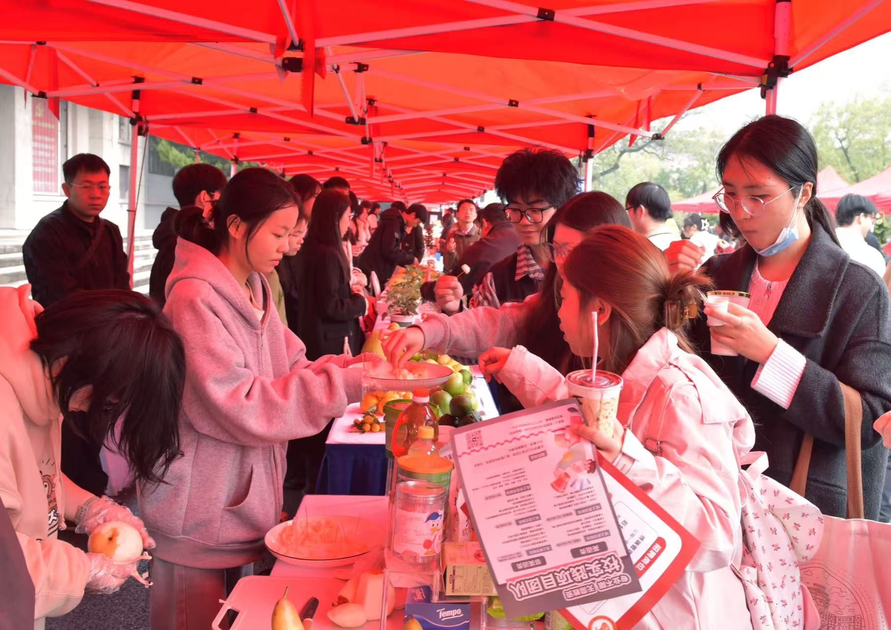 指尖上的园艺创意。趣味互动体验区人头攒动,多肉盆栽DIY环节,参与者手持小型盆器与装饰物,精心打造个性化微景观,在“指尖造绿”的乐趣中感受园艺的创造力。茶艺表演区,专业茶艺师以娴熟技法演绎中国传统茶道,清亮的茶汤倒入古朴茶具,入口甘醇,余韵悠长,引得观众纷纷驻足品鉴。中国传统插花、水果蔬菜创意设计、叶脉书签制作、野生菌知识问答、蛋挞DIY制作、果蔬趣味套圈等一系列活动吸引了众多师生的踊跃参与。师生于欢声笑语中畅享园艺之美,欢呼声与喝彩声此起彼伏,为首届园艺节增添了无限乐趣与活力。