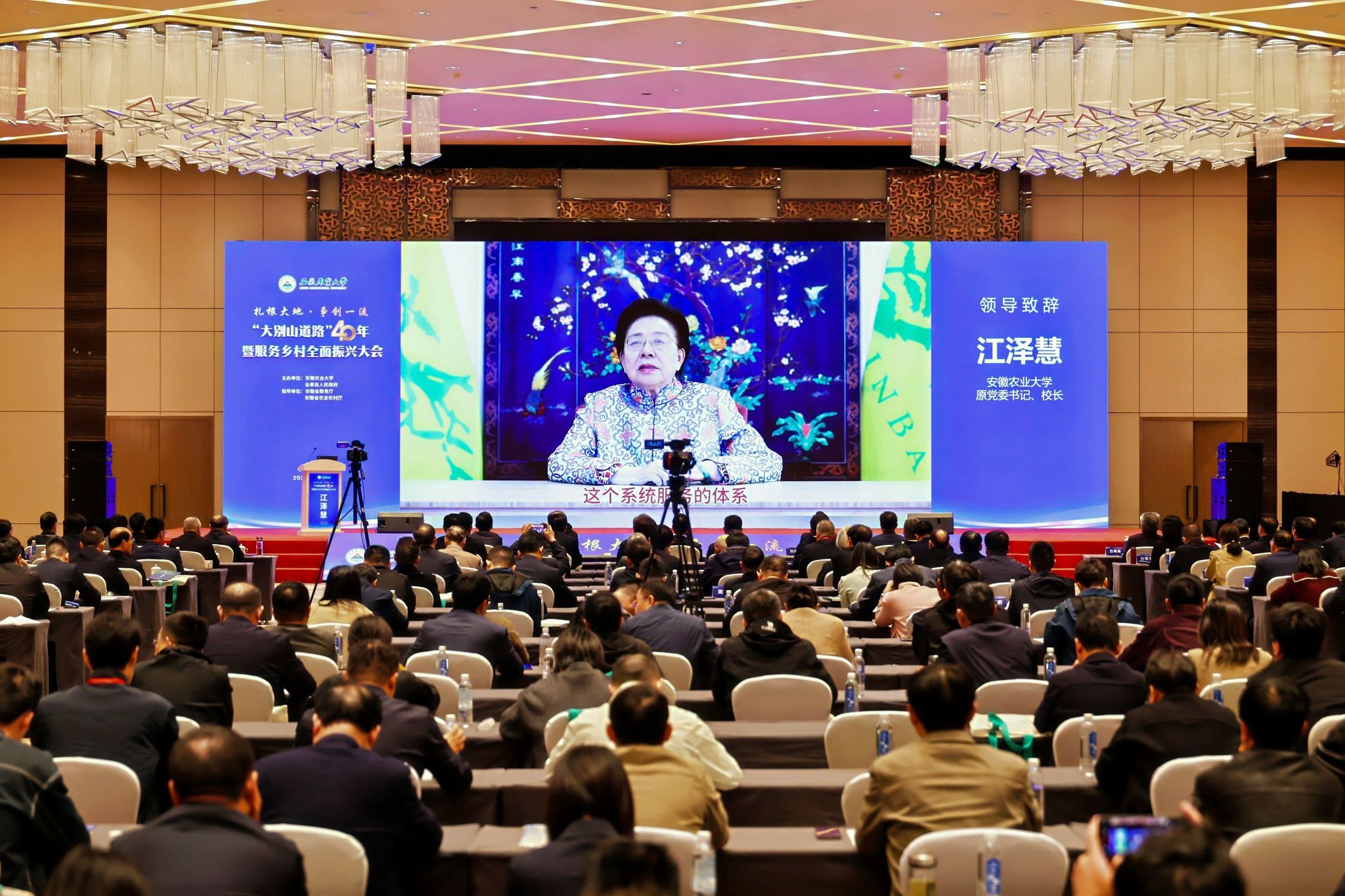 我校原党委书记、校长,国际竹藤组织董事会联合主席、中国花卉协会会长江泽慧通过视频方式致辞,她深情回顾了自己作为“大别山道路”的亲历者、见证者、坚定支持者,与广大师生共同扎根革命老区、服务脱贫致富的奋斗岁月。希望学校继续沿着“大别山道路”阔步前行,勇担历史重任,抢抓发展机遇,全面深化综合改革,大力提升办学水平,为农业强国战略和乡村全面振兴作出更大贡献,续写强农兴国的壮丽篇章。