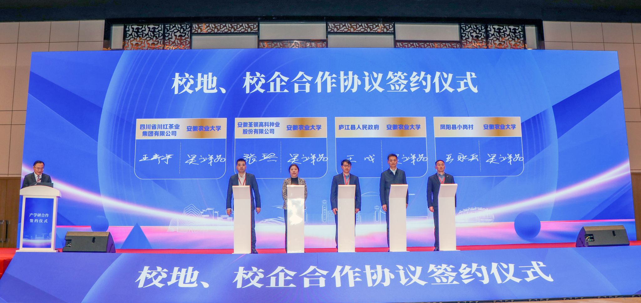 会上,举行了校地、校企合作签约仪式,党委常委、副校长吴祥为代表学校与川红茶业集团有限公司、安徽荃银高科种业股份有限公司、庐江县、小岗村签署合作协议。举行了“1+5”农业科技创新联盟合作签约仪式。党委常委、副校长江海洋代表学校与淮北市、亳州市、蚌埠市、六安市、铜陵市、省农垦集团签约。