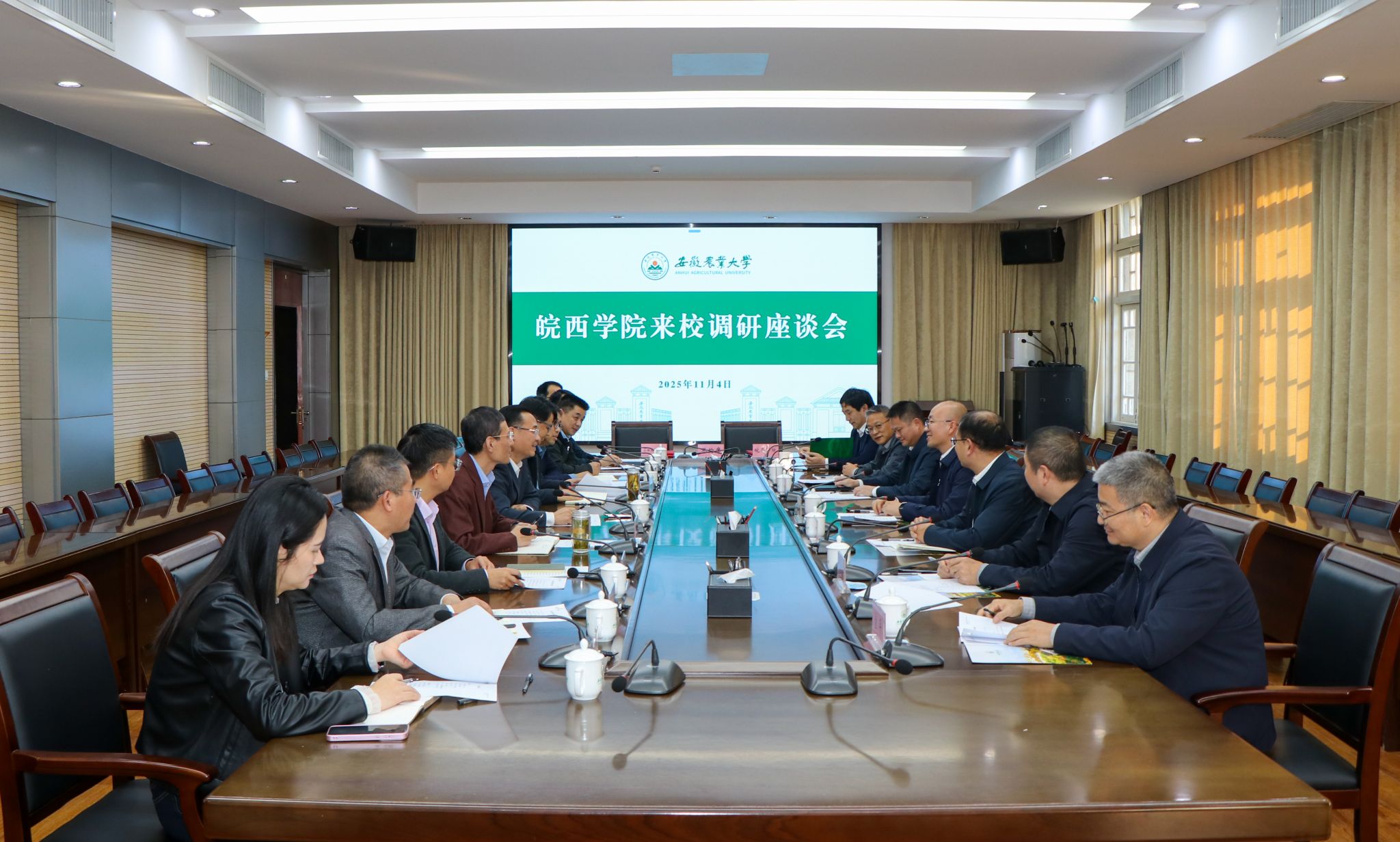 座谈会上,双方分别介绍了学校发展近况,围绕学科建设、人才培养、成果转化、人才引育、平台建设以及动物医院建设管理等方面进行深入交流;一致认为,两校地缘相近、人缘相亲,在办学定位上优势互补,在服务区域经济社会发展上使命共担,要深化全方位、多层次合作;一致表示,将着力构建资源共享、发展共赢格局,推动各项合作走深走实,携手服务现代化美好安徽建设。