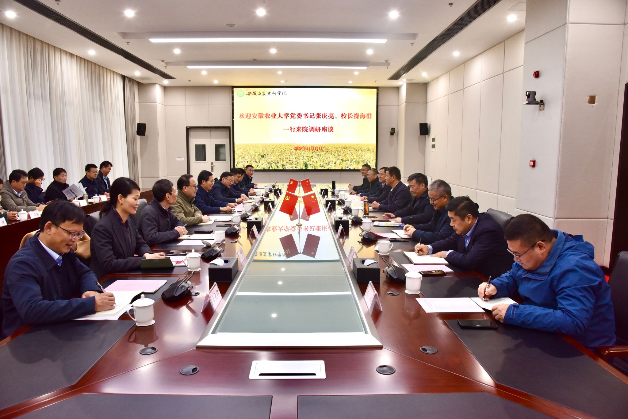 双方一致表示,要在冲刺“十四五”、谋划“十五五”的关键节点,全面总结梳理过去的合作,顺应新形势,抢抓机遇期,开启校院深度合作新征程,共同扛牢服务乡村全面振兴和农业强省建设的政治责任。要打造合作样板,以提升农业综合生产能力和质量效益为目标,以培育农业新质生产力为关键,以“1+5”创新联盟为载体,高站位、大格局谋划校院合作,努力打造地方农业高校与农科院合作典范;要创新合作机制,健全完善校院对接、院所协同、团队融合的多层次、全方位、全链条合作机制,校院层面定期会商,其他层面经常性、不定期交流,畅通信息、凝聚合力;要提升合作成效,突出需求导向、效果导向,坚持“三农”所需与校院所能相结合,发挥各自优势,积极争取“1+5”联盟“国家队”力量和省内其他农业创新力量,打造农业科技人才“大兵团”,打好江淮粮仓建设“大会战”,形成农业科技创新成果转化应用“大场景”,为安徽率先建成农业强省闯新路、做贡献。