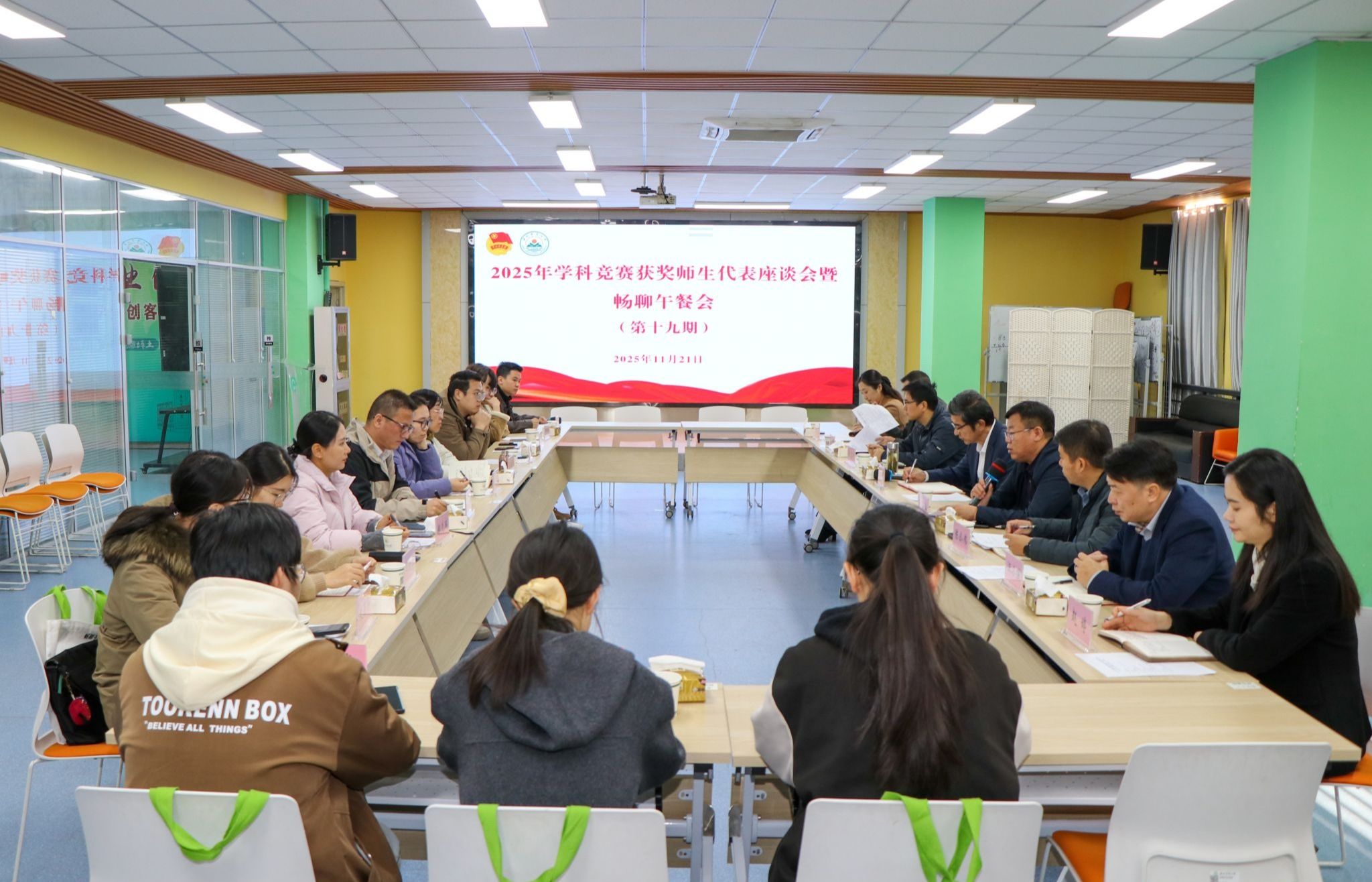 本网讯 11月21日,学校2025年学科竞赛获奖师生代表座谈会暨第十九期“畅聊午餐会”在大学生创客空间路演大厅召开。校党委副书记董雨,校党委常委、副校长江海洋与13名竞赛师生代表齐聚一堂,共话参赛收获成长、畅谈未来改革发展。