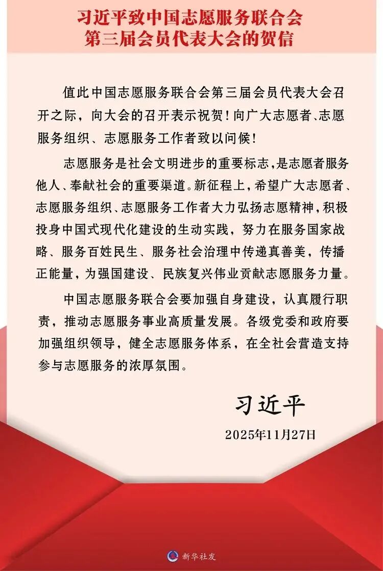 本网讯 11月27日至28日,中国志愿服务联合会第三届会员代表大会在京召开,中共中央总书记、国家主席、中央军委主席习近平发来贺信,向大会的召开表示祝贺,向广大志愿者、志愿服务组织、志愿服务工作者致以问候。