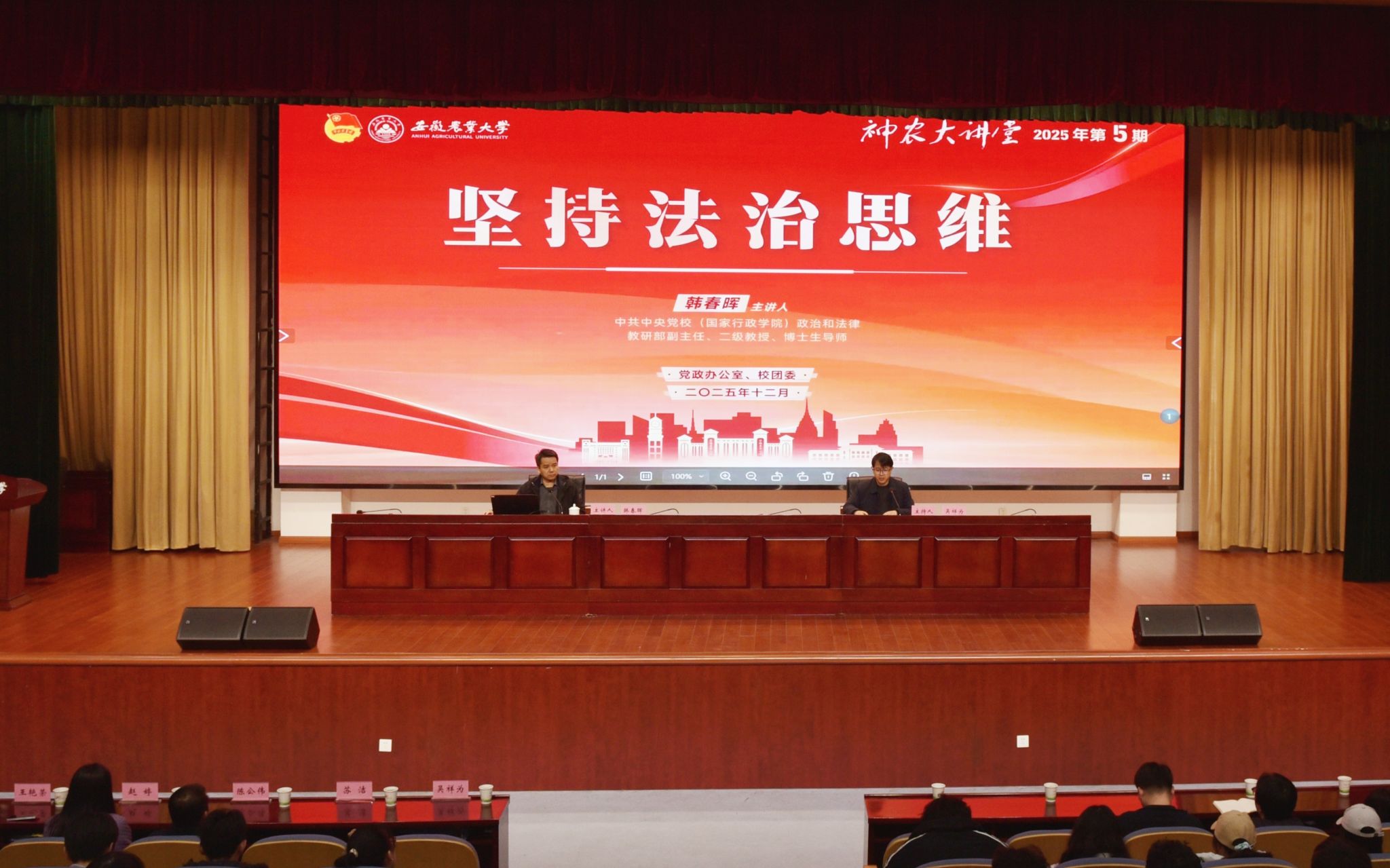 本网讯 12月3日,在第12个国家宪法日到来之际,学校特邀中共中央党校(国家行政学院)政治和法律教研部副主任、二级教授韩春晖做客“神农大讲堂”,在图书馆第一报告厅作题为“坚持法治思维”的专题讲座。校党委书记张庆亮会见韩春晖,校党委常委、副校长吴祥为主持报告会。党政办公室、社会科学处、校团委、人文社会科学学院、马克思主义学院等单位负责人及500余名师生代表参加报告会。