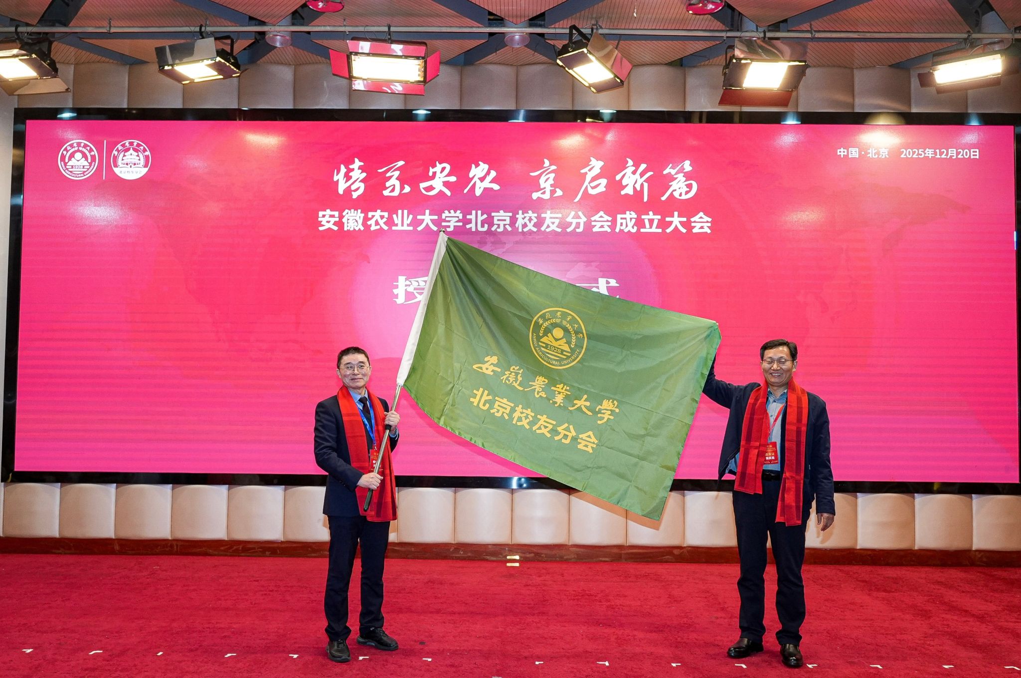 选举结束后,张庆亮为北京校友分会授旗。江海洋、裴树东为当选首届理事会负责人颁发聘书。