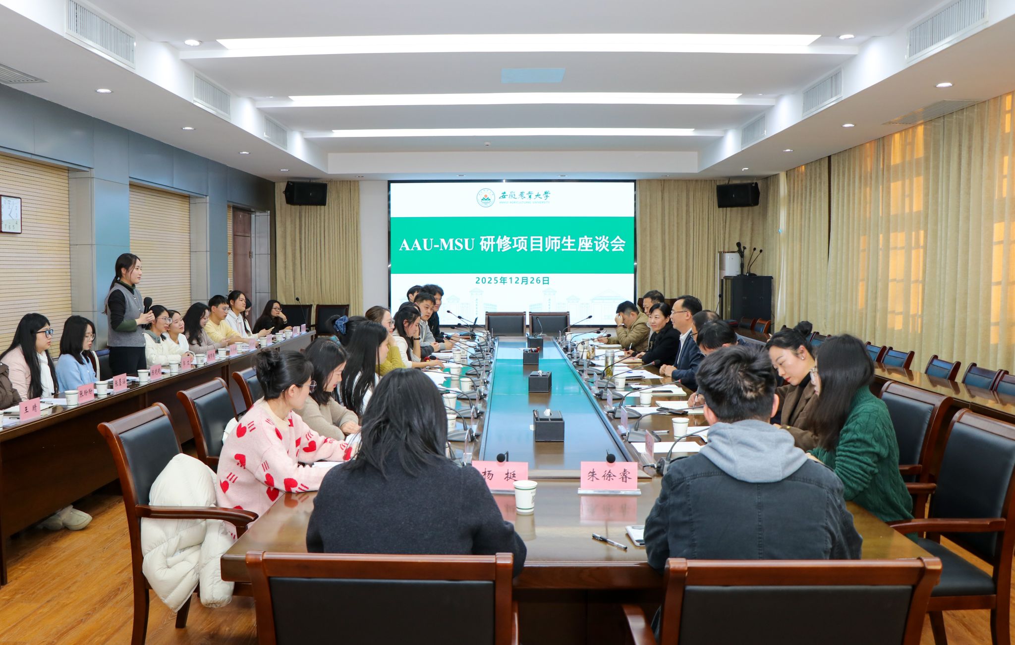 本网讯 12月26日下午,学校召开“安徽农业大学-美国密歇根州立大学(AAU-MSU)农学学科交融提升研修项目”师生座谈会。校党委副书记、校长操海群出席会议并讲话,校党委常委、副校长陈黎卿主持会议。校研工部、学工部、国际交流合作处负责人,项目带队教师与全体研修学生参加会议。