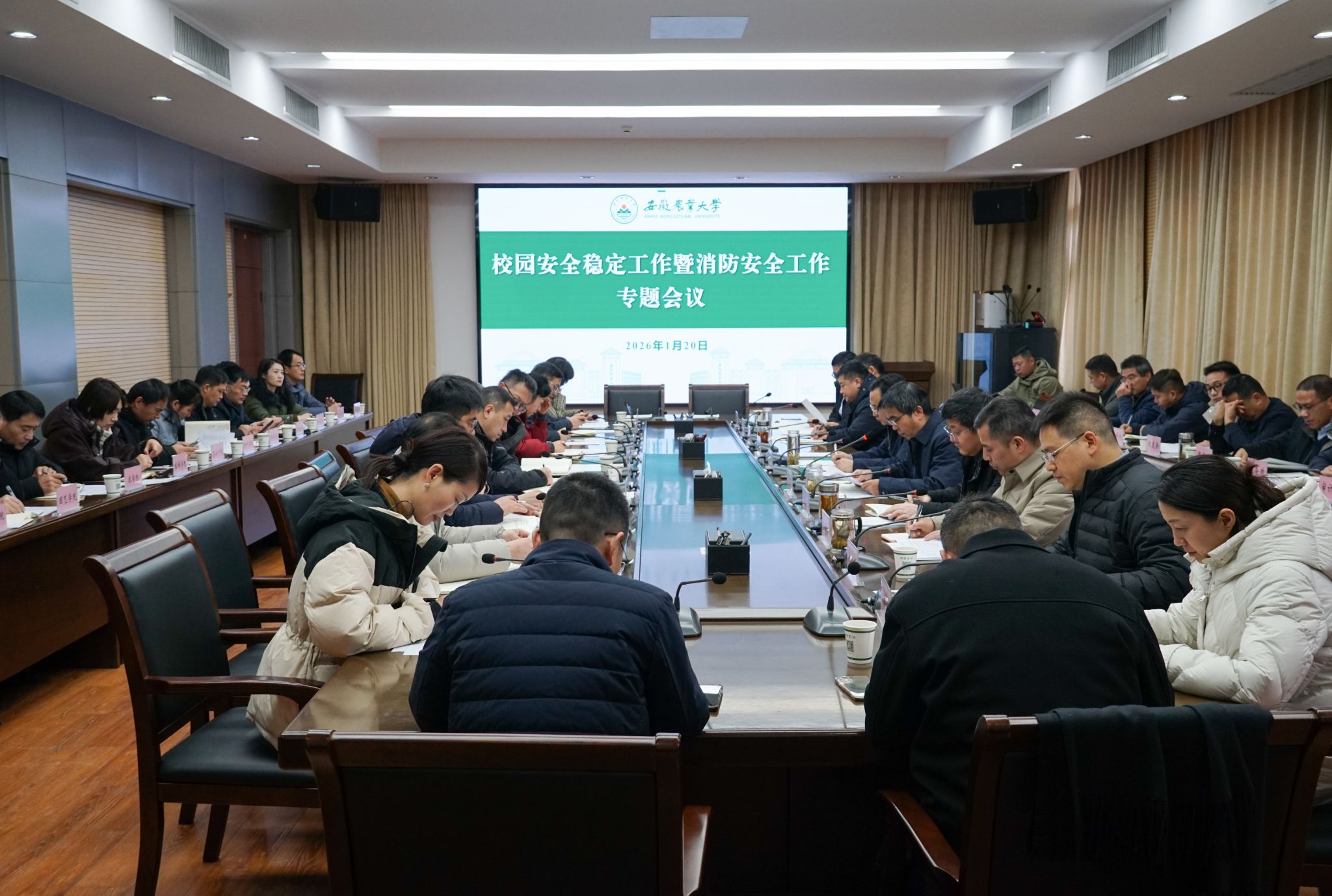 本网讯 1月20日,学校在第三会议室召开专题会议,部署2026年校园安全稳定工作。校党委副书记、校长操海群出席会议并讲话。各部门、各学院主要负责人参加会议。会议由校党委常委、副校长蔡德军主持。