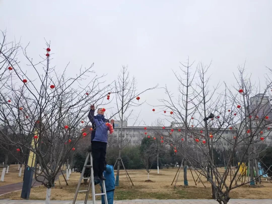 大红灯笼高高挂起,校园的彩灯在花丛中闪烁。绿化师傅修剪枯枝,校医悉心诊断,收发室依旧忙碌,物业师傅在清扫校园……一切都井然有序。