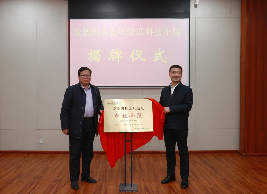 江海洋与谢颖锋共同为“安徽泗县金丝绞瓜科技小院”揭牌。