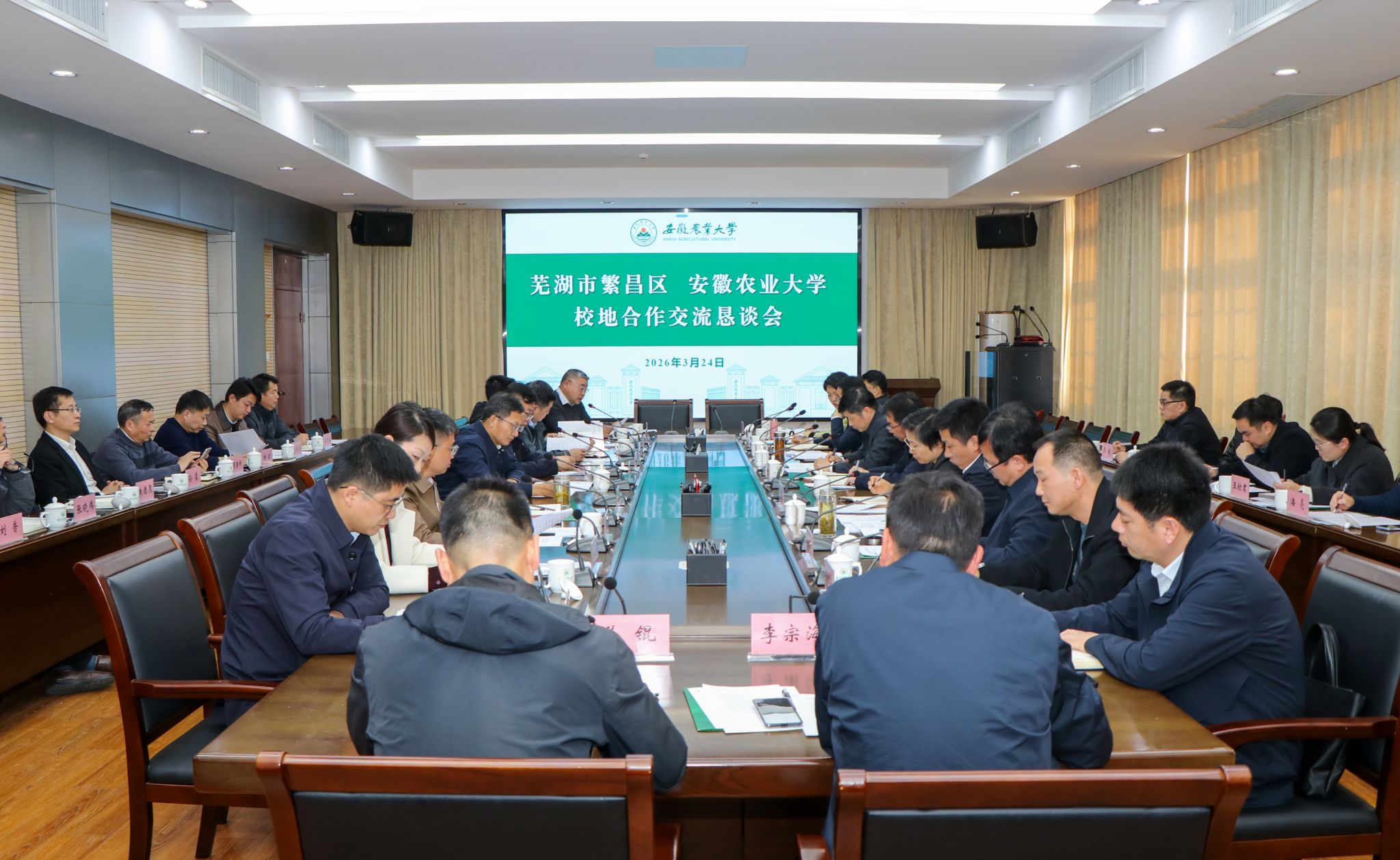 本网讯 3月24日下午,芜湖市繁昌区区委书记汪敏一行来校开展繁昌区专场招聘宣讲活动和校地合作交流恳谈会。校党委书记张庆亮出席会议。校党委常委、副校长江海洋主持召开恳谈会。