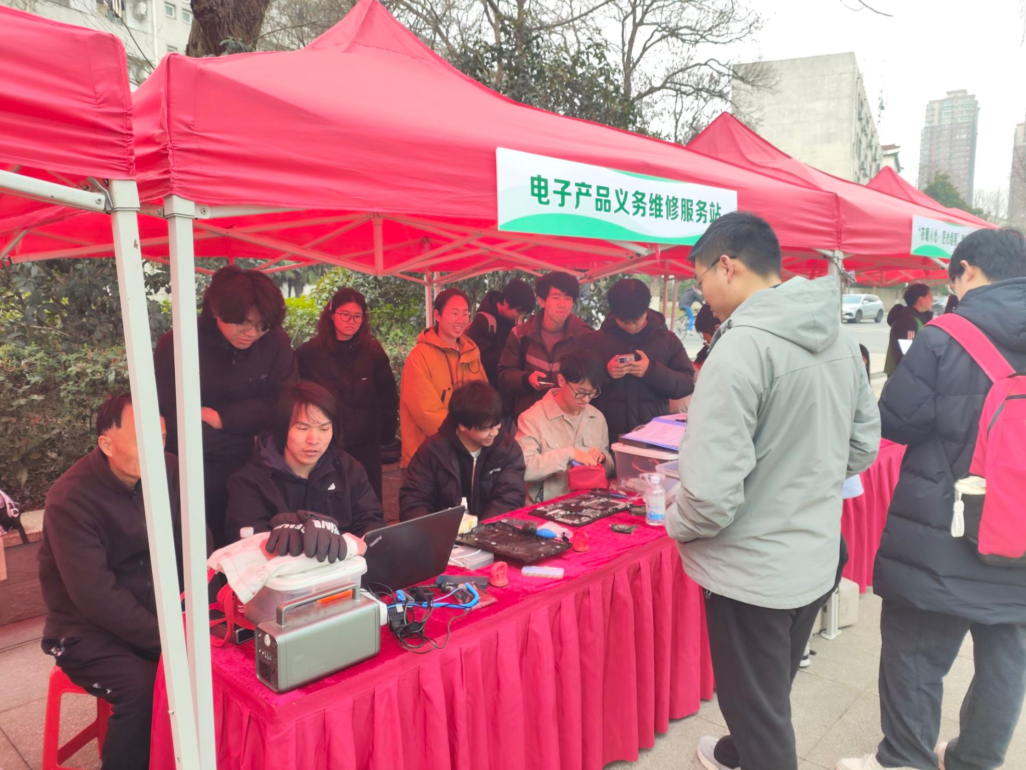 活动现场,各志愿服务展位紧扣专业特色,推动“专业 + 志愿”深度融合。人工智能学院组建电子产品维修队,免费为师生维修手机、电脑并排查电路故障;材料与化学学院开设“衣暖人心,匠心缝春” 便民服务展位,志愿者携带针线、剪刀、纽扣、拉链等工具,提供衣物缝补、纽扣加固、破损修复等贴心服务;校法学会携《民法典》宣传手册,开展反诈宣讲、公益普法及大学生权益维护知识普及;校青年志愿者联合会设立便民服务台,解读志愿者管理办法,指导学生注册加入志愿汇。