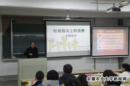 本网讯 11月25日下午,校党委副书记李恩年以兼职辅导员身份走进植保学院2014级植物保护专业班级主题班会现场,与同学们共话“指尖上的浪费”。校团委老师和植保学院全体专兼职辅导员观摩了本次主题班会。