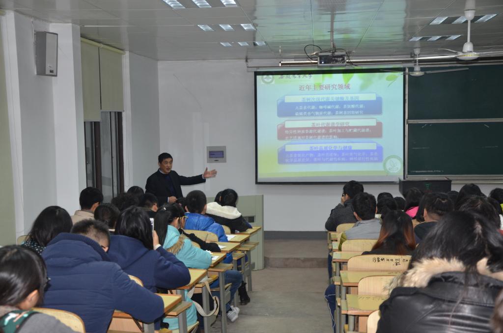 本网讯 12月30日晚,茶业楼112阶梯教室内座无虚席。校党委书记、茶树生物学与资源利用国家重点实验室主任宛晓春教授为茶与食品科技学院茶学学子做了《茶叶生物化学研究进展报告》的专题讲座,学院相关领导、部分教师、研究生等也参加了报告会。