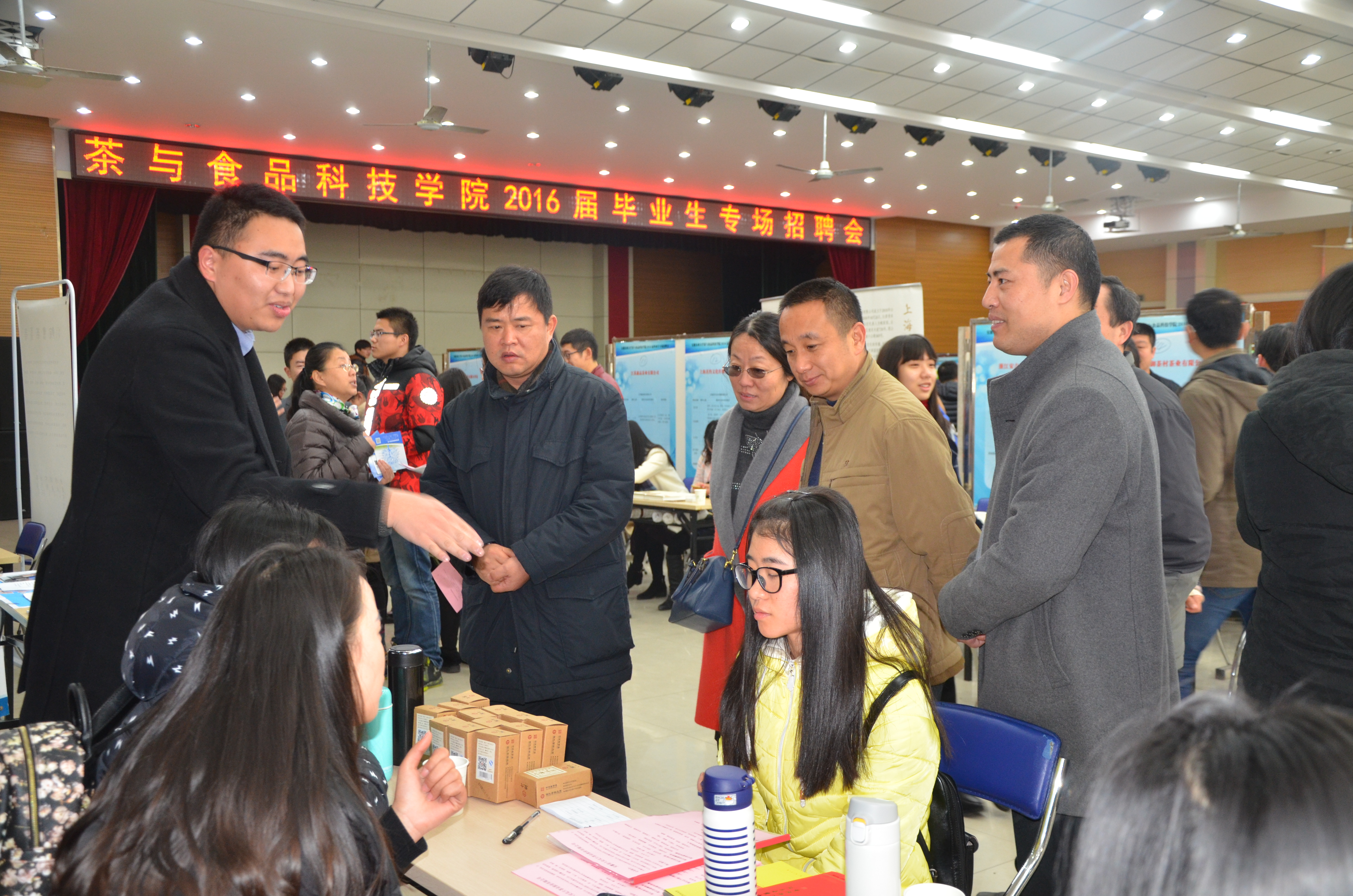 本网讯 1月8日上午,茶与食品科技学院2016届茶学、食品类毕业生专场招聘会在欣苑四楼大学生活动中心举办,副校长蒋家平到会指导,招生就业处领导、学院党政领导参加招聘会。